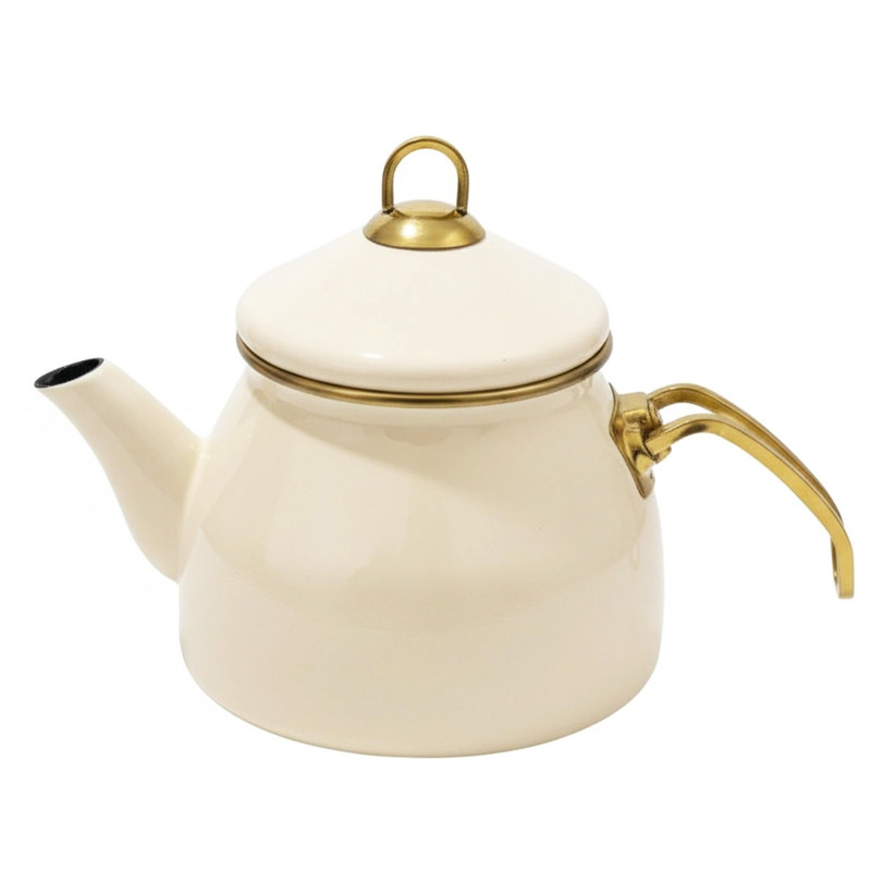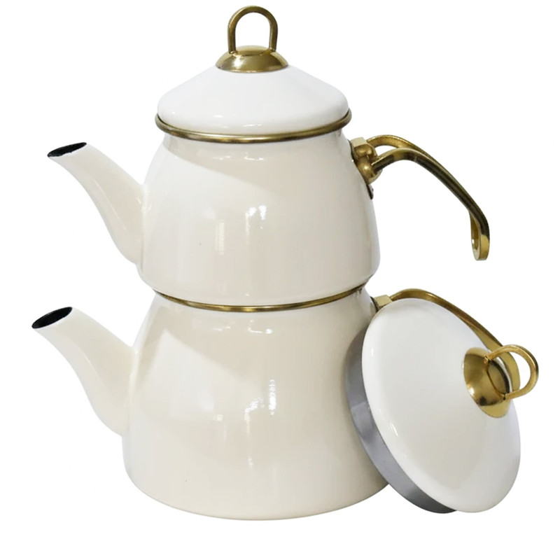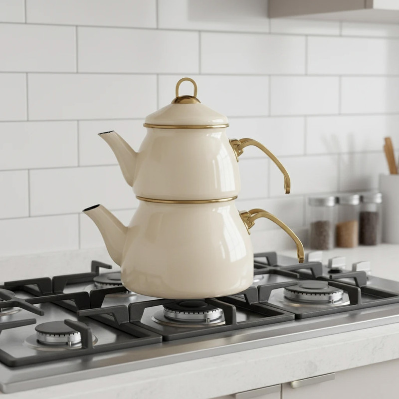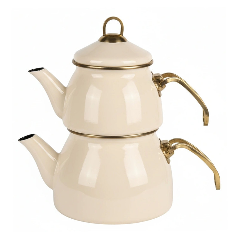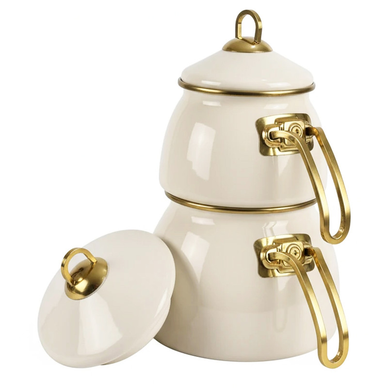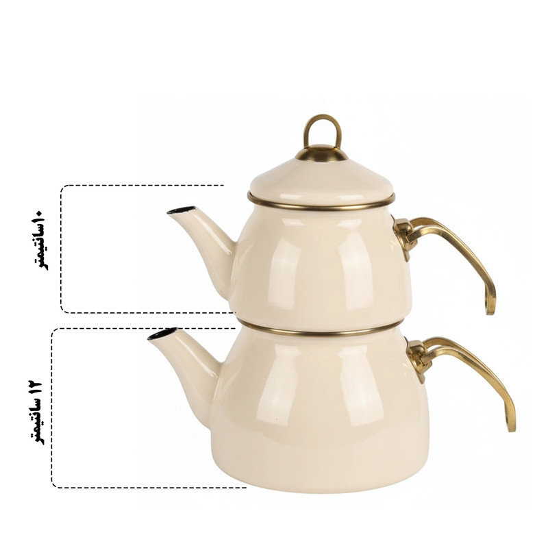 این ست کتری و قوری از جنس لعاب باکیفیت ساخته شده و طراحی کلاسیک و زیبا دارد که جلوهای چشمنواز به آشپزخانه شما میبخشد. رنگ کرم مات بدنه در کنار دستههای فلزی طلایی رنگ، ترکیبی شیک و مدرن ایجاد کرده است. لعاب استفادهشده مقاوم در برابر حرارت و زنگزدگی است و باعث حفظ طعم طبیعی چای میشود.