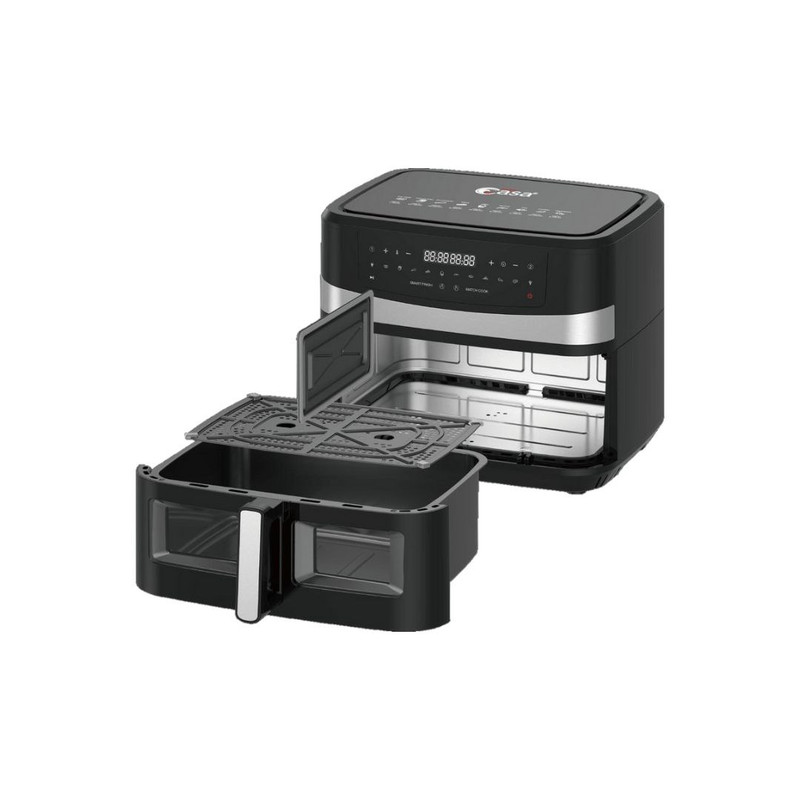 سرخ کن دو قلو سوپر کاسا، گنجایش 10 لیتر، قابلیت استفاده بصورت دو محفظه جدا با تنظیمات مختلف یا استفاده بصورت یک محفظه بزرگ با حجم 10 لیتر، قابلیت قرار گیری یک مرغ کاملا درسته، دارای ده برنامه پخت متنوع شامل: سیب زمینی، ماهی، میگو، گوشت، پیتزا، کیک، مرغ، سبزیجات، مرغ کامل(درسته)، گرم کردن مواد غذایی و ....، قابلیت استفاده بصورت دو مخزن جداگانه یا یک محفظه بزرگ 10 لیتری، قابلیت قرار گیری یک مرغ کاملا درسته، توان مصرفی 2600 وات، تنظیم درجه حرارت از 50 تا 200 درجه سانتیگراد، تایمر ۶۰ دقیقه ای، دارای لامپ داخلی که براحتی میتوانید مراحل پخت مواد غذایی را مشاهده کنید، سرخ کن با طراحی جدید درب شیشه ای که در زمان کارکرد مواد غذایی قابل مشاهده میباشد، پوشش داخلی سرخ کن تفلون عاری از هر گونه مواد شیمیایی (BPA FREE)