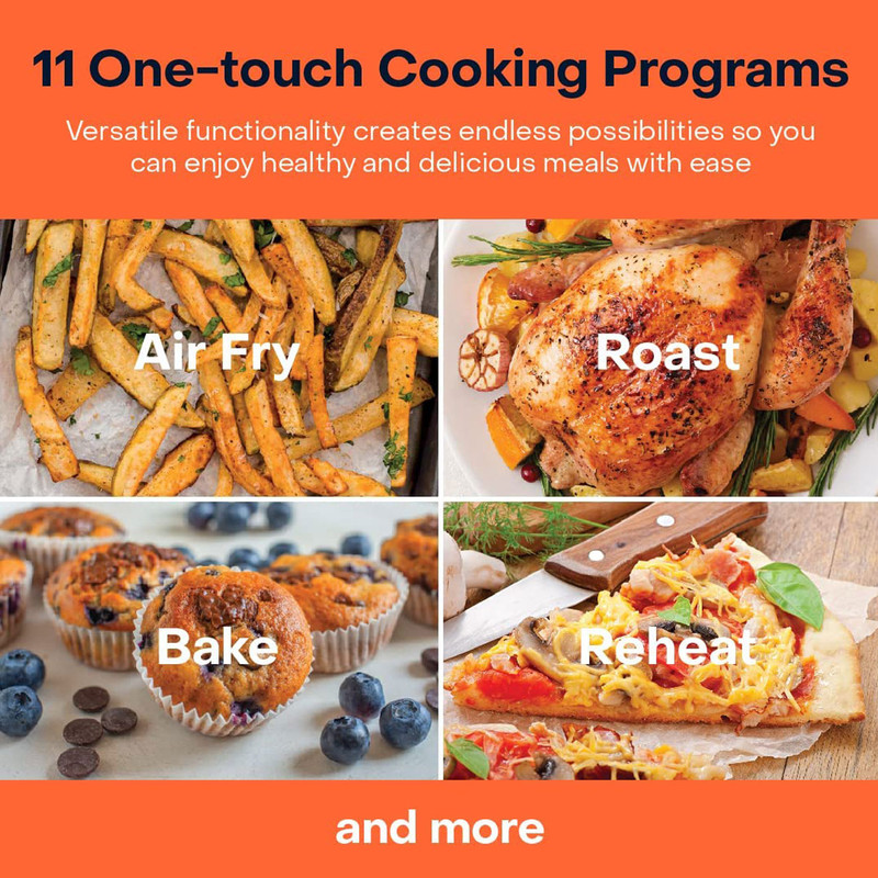 ظرفیت 5.7 لیتر - مناسب تا 1.4 کیلوگرم سیب زمینی سرخ شده یا 1.2 کیلوگرم مرغ کامل، مناسب برای کل خانواده / میزان تولید صدا 55 دسی بل (کمترین در بین سرخ کن های بازار) / 11 برنامه پخت و پز ( دارای 5 برنامه اصلی پخت - سرخ کردن با هوا، کباب کردن، پخت، آبگیری (میوه خشک کن)، گرم کردن مجدد و 6 برنامه آماده پیش تنظیم - سیب زمینی سرخ شده، مرغ، برگر، استیک، ماهی، سمبوسه ) / دکمه های Favorite به شما امکان می دهد تنظیمات 3 دستور غذای مورد علاقه خود را برای دسترسی سریع تر ذخیره کنید / پخت و پز بی صدا – با سطح سر و صدای 55 دسی بل، از اکثر سرخ کن ها بی صداتر است، بنابراین می توانید با آرامش آشپزی کنید