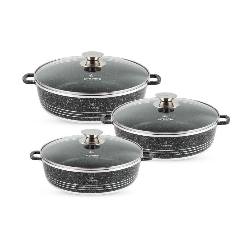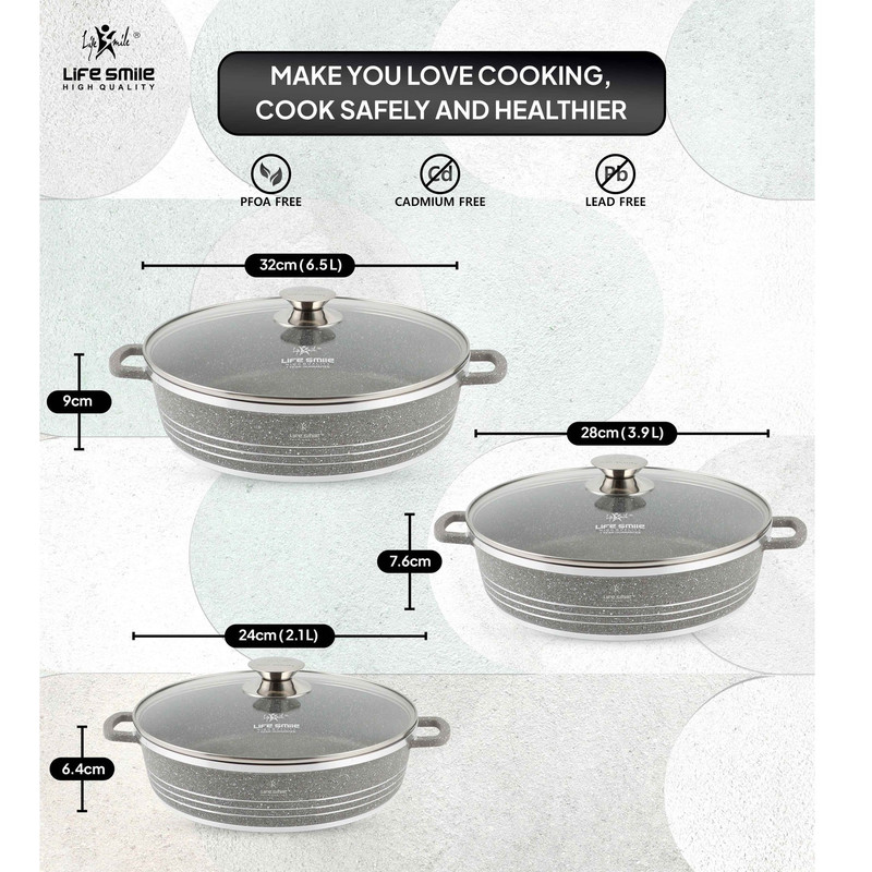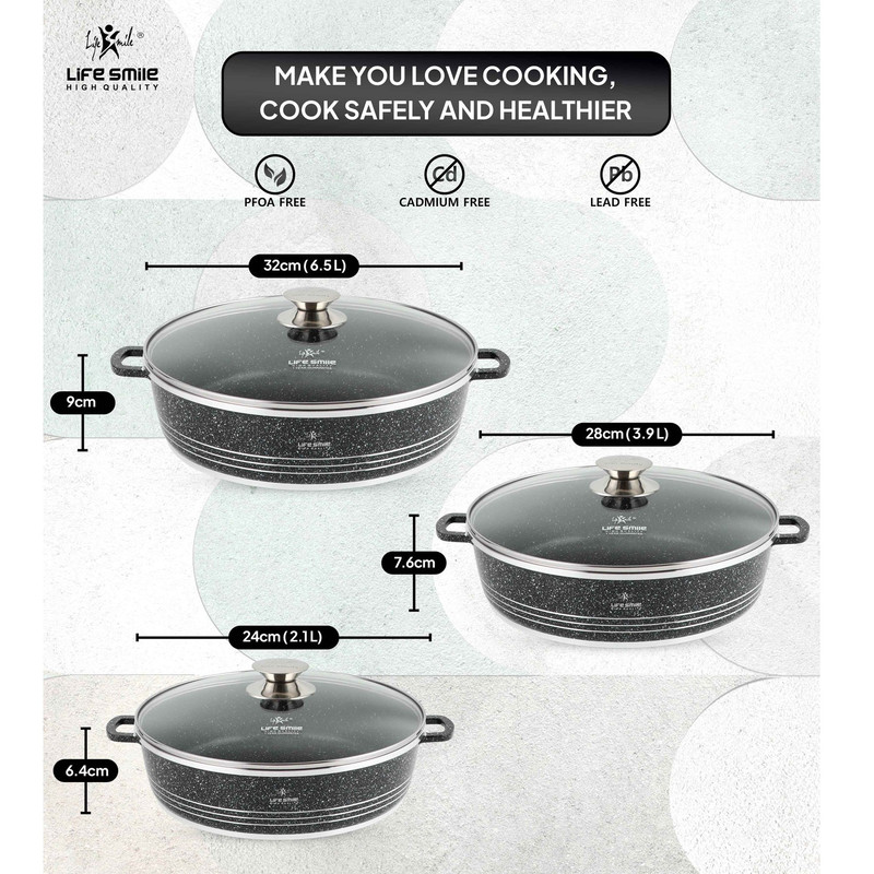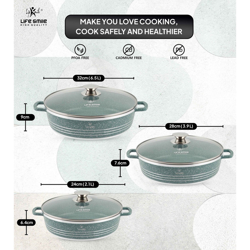 این سرویس تابه لایف اسمایل شامل: تابه سایز 24 سانتی متر (2.1 لیتر)، 28 سانتی متر (3.9 لیتر)، 32 سانتی متر (6.5 لیتر). تابه های پخت و پز با کیفیت ،بدنه آلومینیومی دایکاست ممتاز ،پوشش گرانیت نچسب بادوام ،درب شیشه ای مقاوم با دریچه بخار ،دسته های جانبی قالبی ،بدون PFOA و قابل استفاده در مایکروویو ،سرامیک هالوژن گاز الکتریک