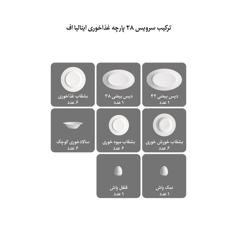 سرویس غذاخوری 28 پارچه 6 نفر چینی زرین ایران مدل ایتالیا اف ماهور درجه 3