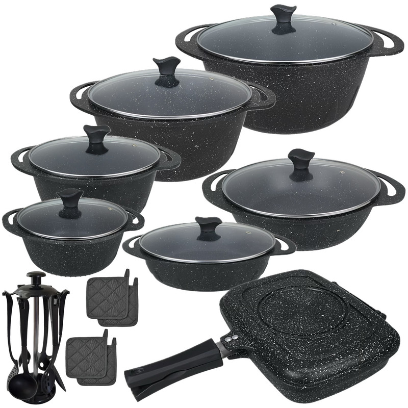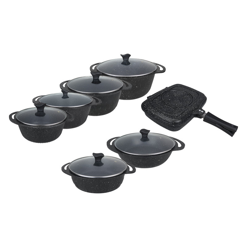 قابلمه ها سایز 32،28،24،20 به همرا درب پیرکس سوپاپ دار جهت تخلیه بخار،تابه ها سایز 28،24 به همرا درب پیرکس سوپاپ دار،تابه رژیمی سایز 32،پوشش داخلی و خارجی هر دو نانو گرانیت طبیعی،سرویس کفگیر ملاقه به همراه دستگیره