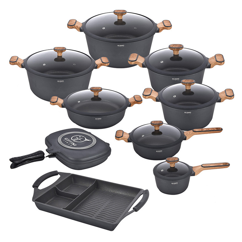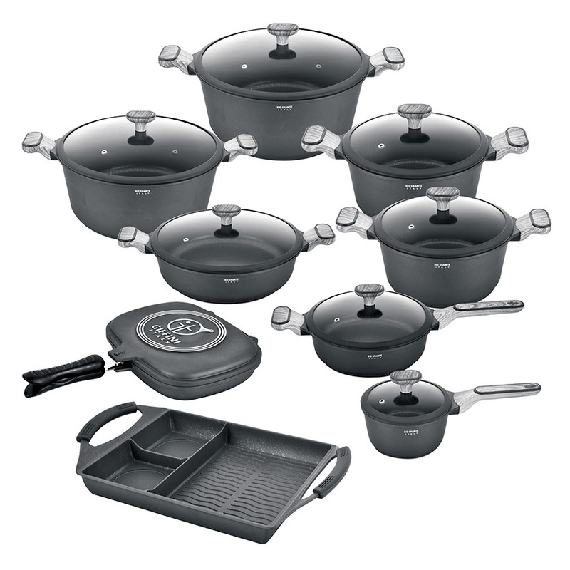 - ست پخت و پز شامل: - یک عدد قابلمه سایز 32 - ابعاد: طول 44.5 ، عرض 33 و ارتفاع 16 سانتیمتر - وزن: 3110 گرم - یک عدد قابلمه سایز 28 - ابعاد: طول 39 ، عرض 29 و ارتفاع 14 سانتیمتر - وزن: 2430 گرم - یک عدد قابلمه سایز 24 - ابعاد: طول 34 ، عرض 25 و ارتفاع 12 سانتیمتر - وزن: 1520 گرم - یک عدد قابلمه سایز 20 ابعاد: طول 29، عرض 21 و ارتفاع 10 سانتیمتر - وزن: 1085 گرم یک عدد تابه سایز 24 - ابعاد: طول 44 ، عرض 25 و ارتفاع 6 سانتیمتر - وزن: 1590 گرم - یک عدد تابه سایز 30 - ابعاد: طول 40 ، عرض 29و ارتفاع 8.5 سانتیمتر - وزن: 2095 گرم - یک عدد تابه 3 خانه گریل سایز 45 - ابعاد: طول 40.5 ، عرض 26.5 و ارتفاع 6 سانتیمتر - وزن: 2000 گرم - تابه دو طرفه سایز 30 - ابعاد: طول 45، عرض 28و ارتفاع 6 سانتیمتر - وزن: 1885 گرم -کفه اینداکشن چدنی