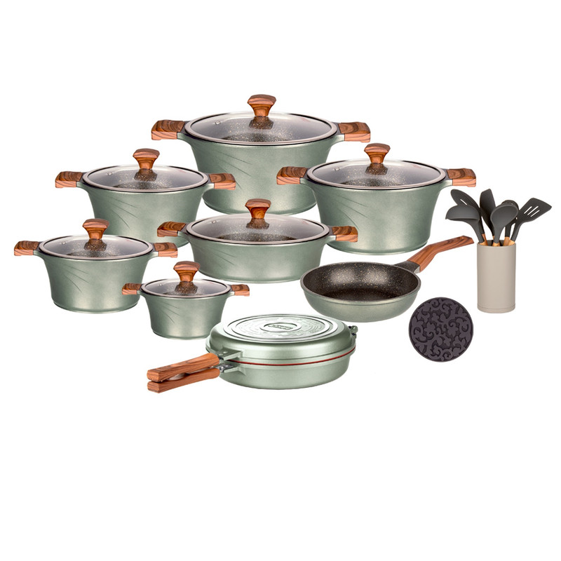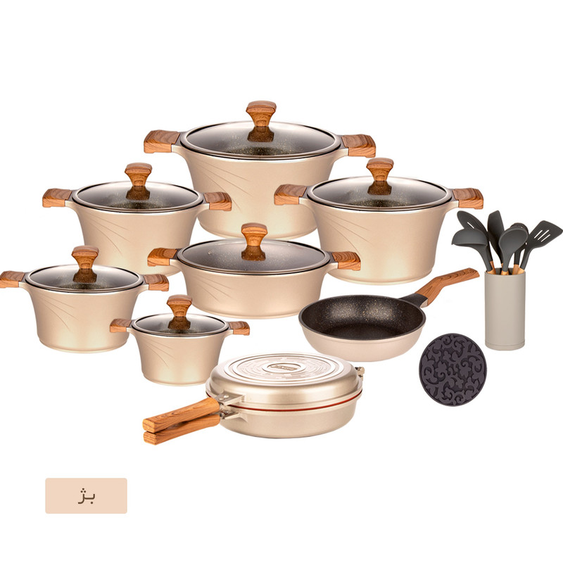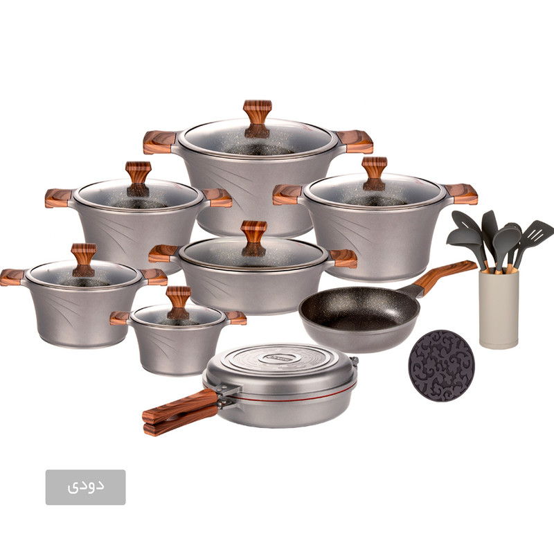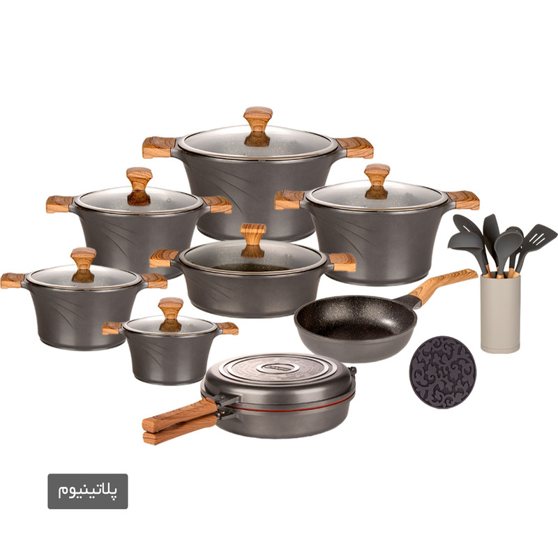این سرویس شامل: یک عدد قابلمه سایز 16 یک عدد قابلمه سایز 20 یک عدد قابلمه سایز 24 یک عدد قابلمه سایز 28 یک عدد قابلمه سایز 32 یک عدد تابه دودسته سایز 28 یک عدد تابه دوبل گرد سایز 28 یک عدد تابه تکدسته سایز 24 هفت پارچه کفگیر و ملاقه چوبی یک عدد زیرقابلمه ای