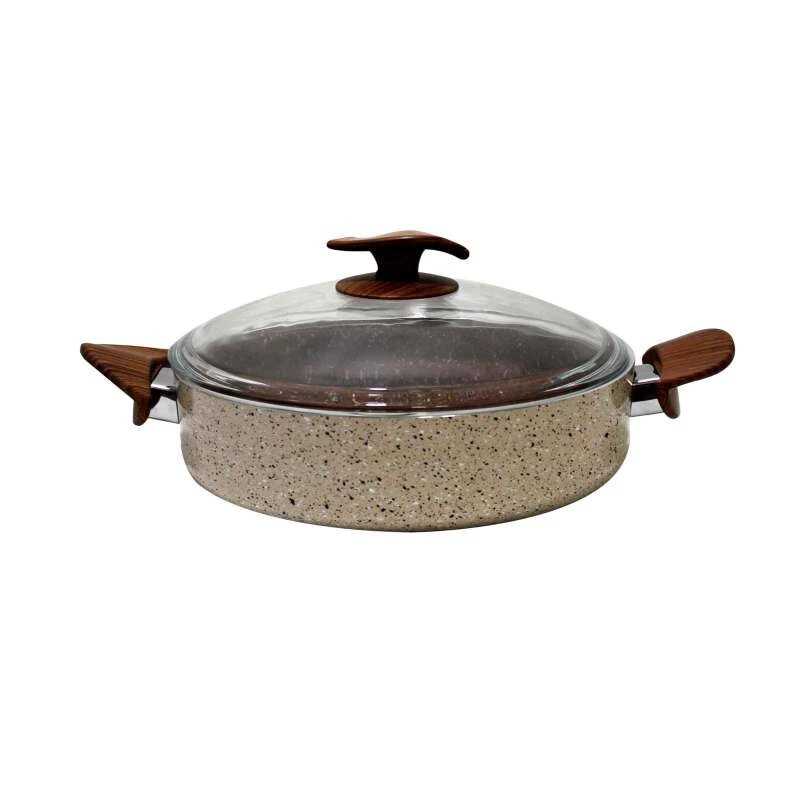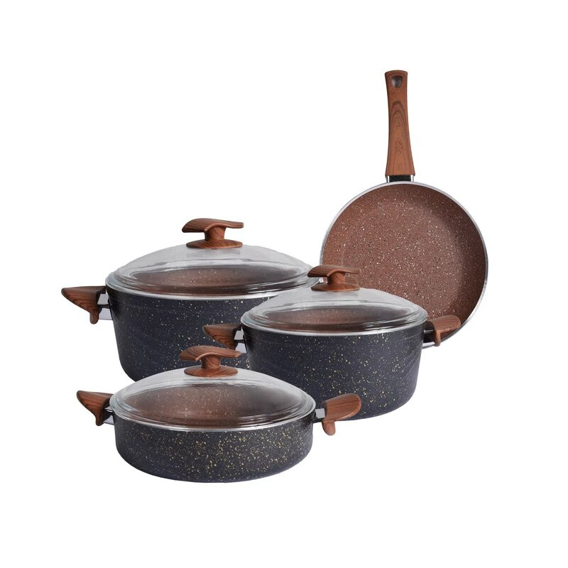 سرویس شامل قابلمه سایز 26 سانتی متر قابلمه سایز 30 سانتی متر تابه تک دسته سایز 30 سانتی متر تابه دو دسته سایز 26 سانتی متر طراحی منحصر بفرد تمامی مواد اولیه و متریال استفاده شده ساخت ترکیه می باشد جنس گرانیت نچسپ استفاده از آلومینیوم خالص 98٫5 درصدی بدون استفاده از ضایعات و فلزات مضر (مانند سرب) یکنواختی و صافی بالا در مراحل ساخت محصولات عدم وجود هرگونه درز یا سوراخکاری یا پرچ که موجب سهلوت در شستشو و نظافت میشود. استحکام و سختی بسیار بالا و عدم شکنندگی دارا بودن نشان استاندارد Bio آلمان به عنوان تضمین حفاظت محیط زیست قابلیت بازیافت محصولات پوشش داخلی از نوع گرانیت (ماربل) ساخت kimflon مقاوم بودن رنگ سیلیکونی بکار رفته محصولات در برابر حرارت دارای سوپاپ اطمینان بخار (تعبیه سه برجستگی در لبههای درب پیرکس جهت خروج بخار) دستهها از جنس باکالیت نسوز ساخت ترکیه (مقاوم در برابر حرارت غیرمستقیم تا 120 درجه سانتیگراد)