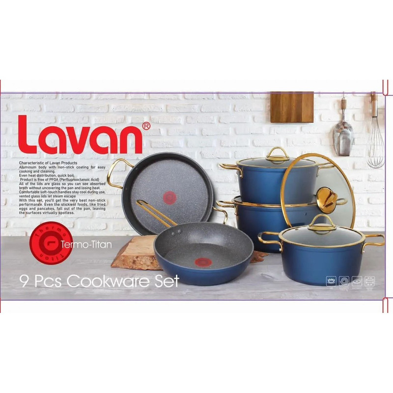 سرویس قابلمه لاوان 9 پارچه شامل سه قابلمه با سایزهای 20 و 24، 28 و دو تابه تابه تک دسته در سایز : 24 و تابه دو دسته در سایز : 28 ابزار آشپزی است. بدنهی این سرویس از آلومینیوم انتخاب شده و روکش داخلی آن گرانیتی است. کفی ظروف ضدخش طراحی شده است که در صورت استفاده روی انواع اجاق گاز، آسیبی متوجه آنها نخواهد بود. درپوشهای این ظروف از شیشه بوده و دارای یک رینگ استیل هستند که مانع از ایجاد خش روی لبههای ظروف میشود.