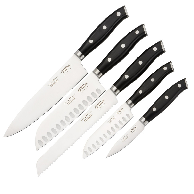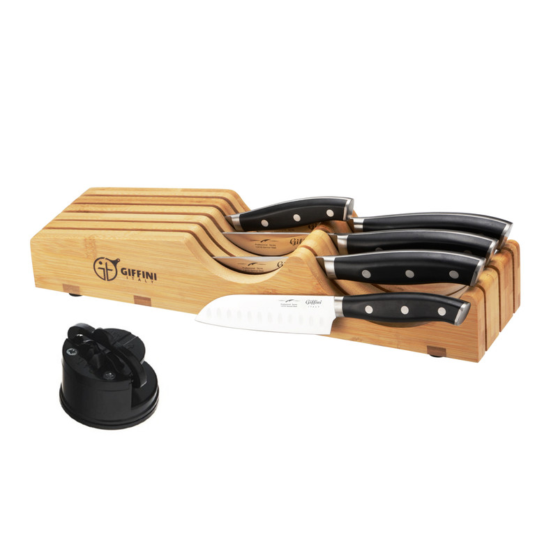 -تیز شده توسط لیزر بسیار دقیق -جنس تیغه ها عالی و بسیار تیز میباشد -دسته و بدنه یک تکه و سرهم میباشد و امکان جدا شدن را هرگز ندارد. - پایه قابل شستشو میباشد. -کاردها ساخت شرکت GIFFINI میباشد شامل : - چاقو برش سایز ۱: طول کلی ۱۹.۵، طول تیغه ۸.۲ سانتیمتر - چاقو برش نان: طول کلی ۳۲، طول تیغه ۱۹ سانتیمتر - چاقو برش سایز ۳: طول کلی ۲۳، طول تیغه ۱۱.۵ سانتیمتر - چاقوی سرآشپز: طول کلی ۳۲، طول تیغه ۱۹ سانتیمتر -چاقوی برش سایز ۴:طول کلی۲۸.طول تیغه ۱۹ سانتی متر - -پایه کارد درجه1 -.مناسب برای قراردان داخل کشو کابینت و روی اپن یا کانتر-یک چاقو تیزکن رومیزی