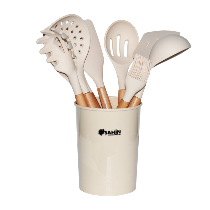 محصول کشور: ترکیه - تعداد : 9 پارچه به همراه استند - جنس : سیلیکون - قاشق: 31 سانتی متر - کاردک: 32 سانتی متر - ملاقه : 32 سانتی متر - آبکش: 33 سانتی متر - انبر پاستا: 32 سانتی متر - فرچه : 27 سانتی متر - قاشق چاک دار : 31 سانتی متر - ابکش شکاف دار : 32 سانتی متر - کاردک : 32 سانتی متر - جنس استند : پلاستیک - ابعاد استند : 12x12x16 - جنس دسته : چوبی - قابل شستشو در ماشین ظرفشویی