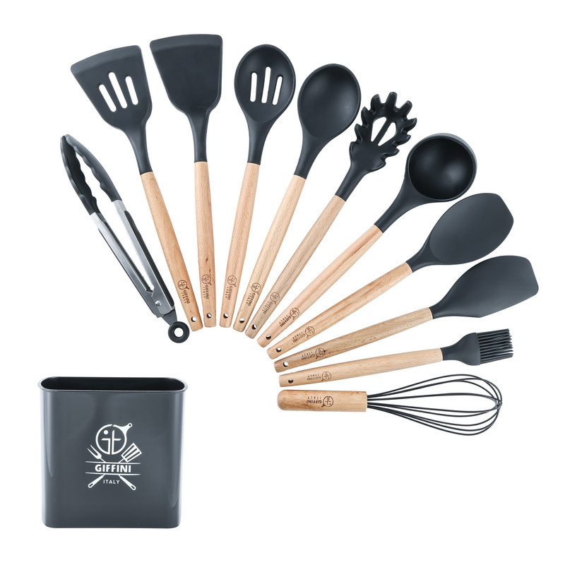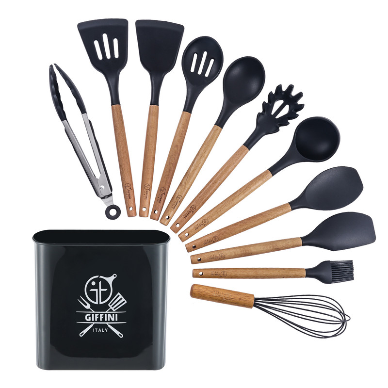 -ساخت شرکت GIFFINI -سیلیکون اصل با تحمل حرارت +۲۳۰ -دارای استاندارد FDA امریکا -دارای دسته چوب اصل بامبو -دارای سبد نگهدارنده مقاوم -شامل اقلام ذیل: -کفگیر پخت کوکو و غیره -شیار دار -ملاقه -قاشق خورشت بدون سوراخ -قاشق خورشت شیاردار -همزن -فرچه مخصوص روغن و شیرینی درست کردن -کفگیر پخت کوکو و غیره (بدون شیار) -لیسک درست کردن شیرینی و غیره -انبر با سر سیلیکون مخصوص پخت و پز و سرخ کردن -جی فی نی اصل -بسیار با کیفیت و مقاوم