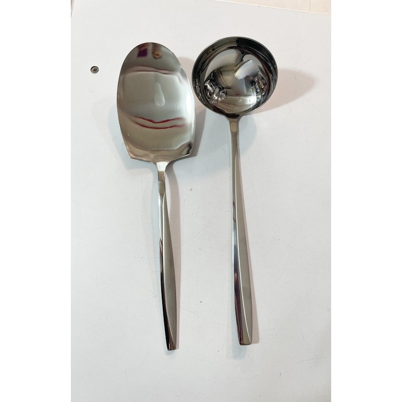 ورق استیل براق 18/10 ، طول کفگیر 29.2 سانتیمتر طول دسته کفگیر 18 سانتیمتر ، عرض دهانه کفگیر 7.5 سانتیمتر ، طول دسته ملاقه 22.5 سانتیمتر ، قطر دهانه ملاقه 8 سانتیمتر ، کیفیت ساخت عالی و درجه 1