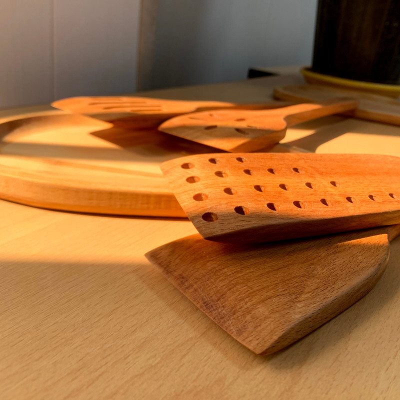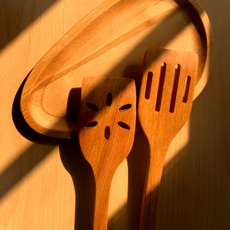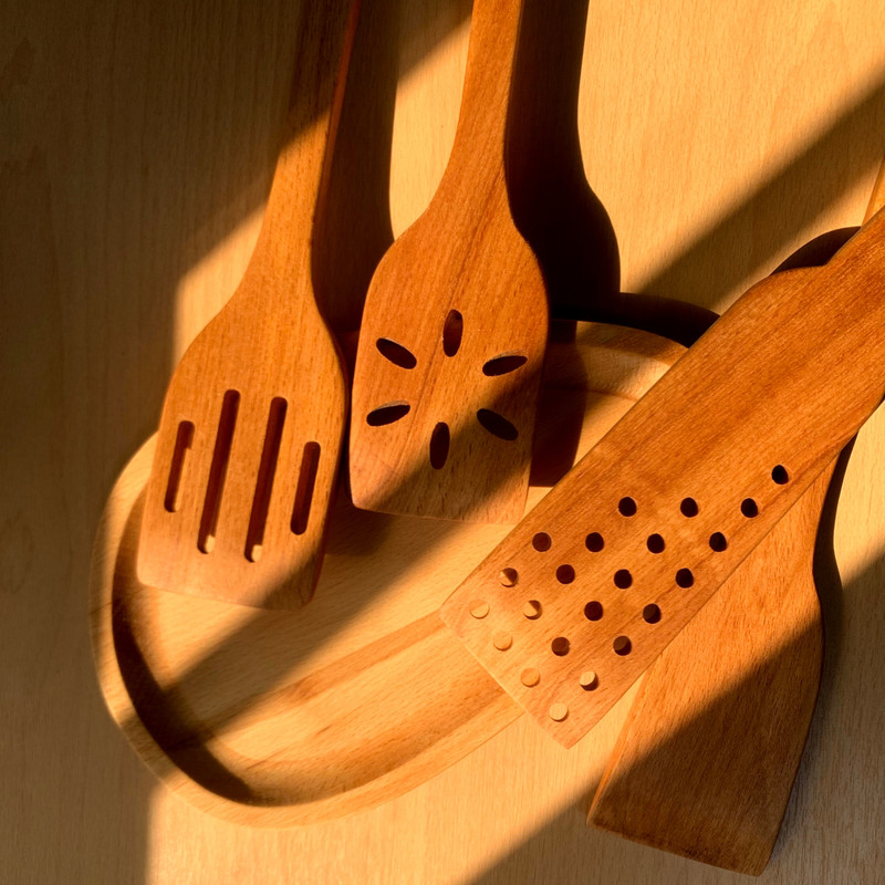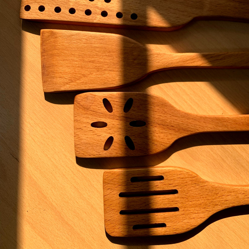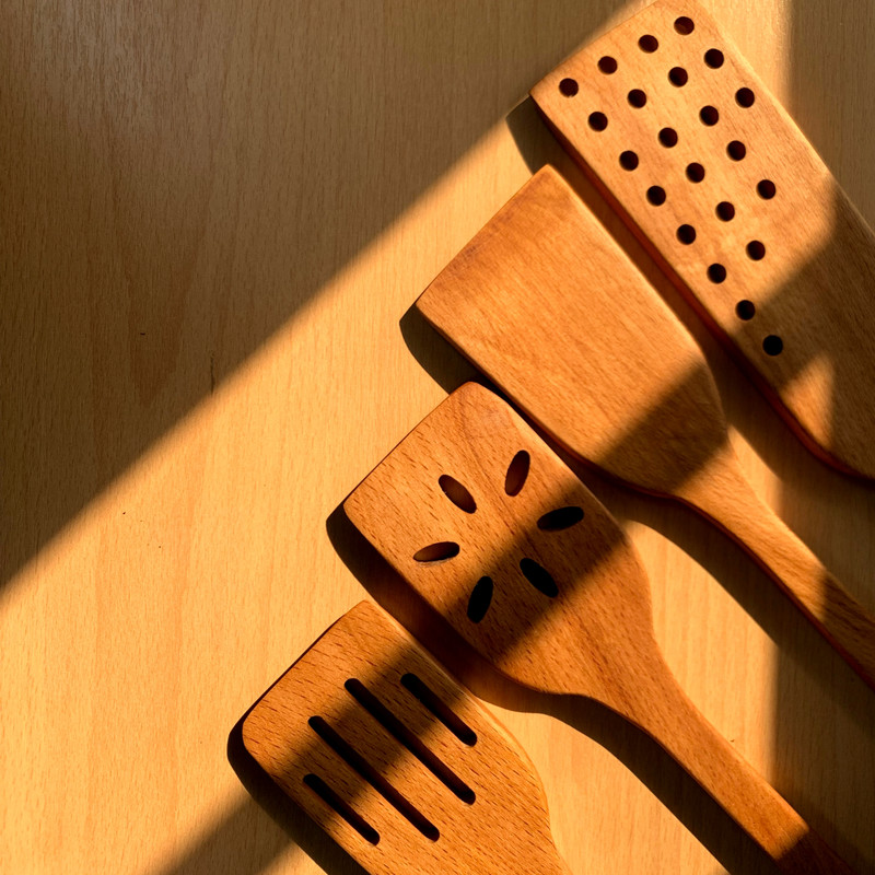 ست ۴ تکه کفگیر چوبی دستساز از چوب راش، هر قطعه از یک تکه چوب تراشیده شده و بدون استفاده از چسب ساخته شده است. سطح با روغن گیاهی بذر کتان پرداخت شده و صیقلی شده تا تجربهای لطیف و ایمن در آشپزی فراهم شود.