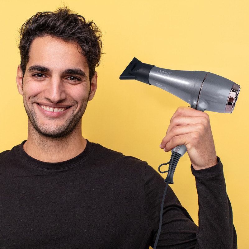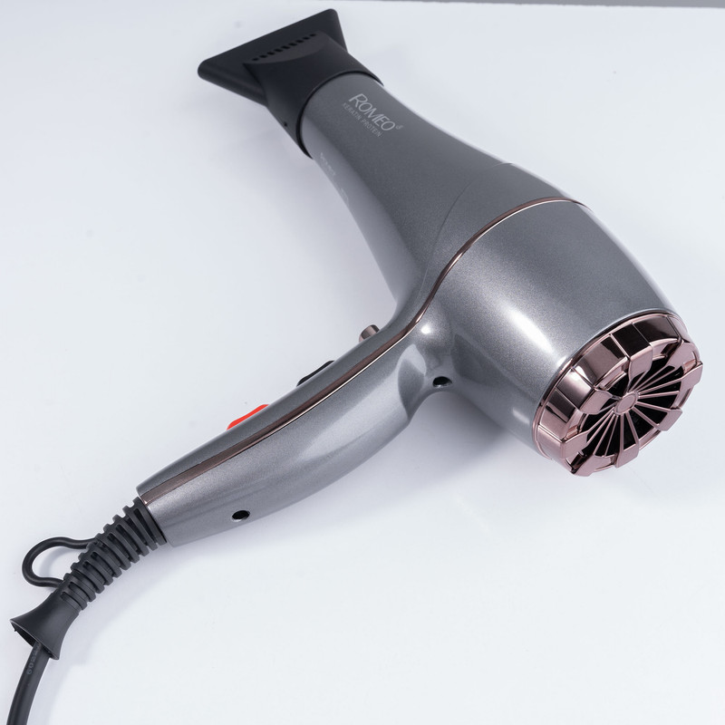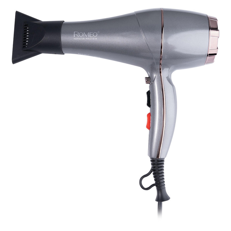 سشوار حرفهای رومئو مدل RM-5858، موتور AC با توان مصرفی 2200 وات، دارای قابلیت باد سرد، طراحی ارگونومیک، دارای حلقه آویختن، با حالت صافکننده و حجمدهنده، وزن 450 گرم، تنظیم حرارت 3 حالته و کنترل سرعت 2 حالته، به همراه متمرکزکننده باریک