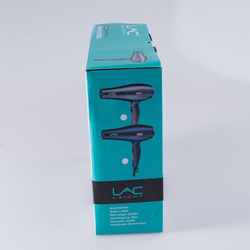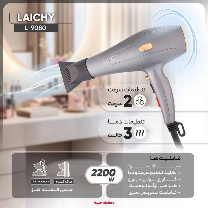 سشوار حرفهای لایچی مدل L-9080، موتور AC با توان مصرفی 2200 وات، دارای قابلیت باد سرد، طراحی ارگونومیک، فناوری تولید یون، با حالت صافکننده و حجمدهنده، وزن 500 گرم، تنظیم حرارت 3 حالته و کنترل سرعت 2 حالته، به همراه 2 سری متمرکزکننده
