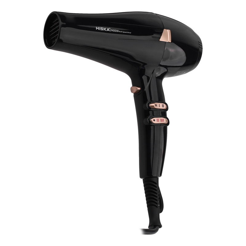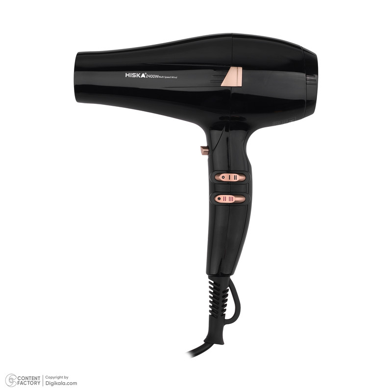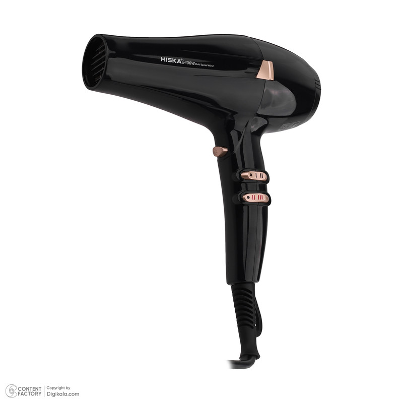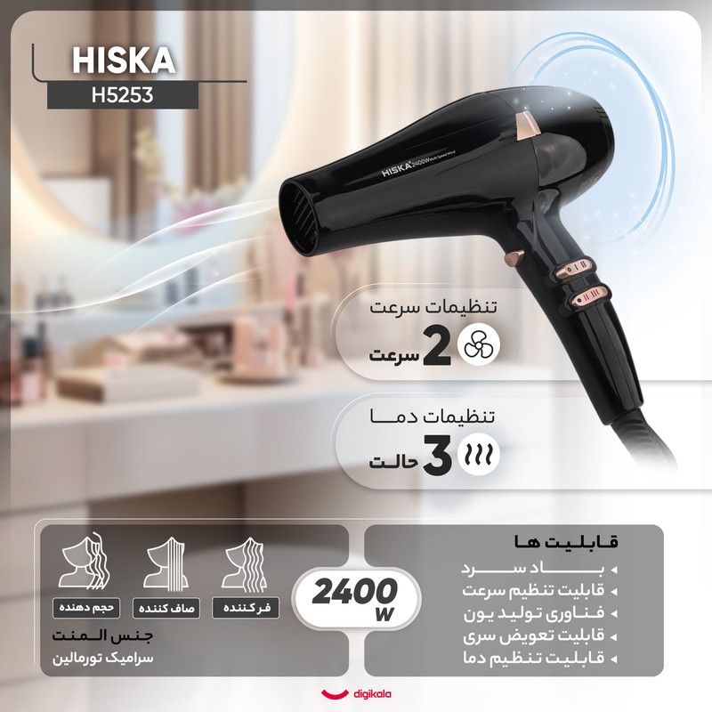 سشوار حرفهای هیسکا مدل H5253، موتور AC با توان مصرفی 2400 وات، دارای قابلیت باد سرد، فناوری تولید یون، حلقه آویختن، با حالت فرکننده، صافکننده و حجمدهنده، وزن 1100 گرم، تنظیم حرارت 3 حالته و کنترل سرعت 2 حالته، به همراه 2 عدد سری متمرکزکننده