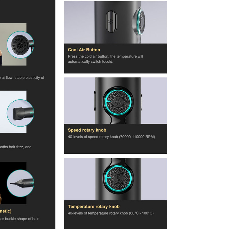 BLDC موتور با حداکثر 110 ،000 RPM برای خشک کردن سریع. 40 تنظیمات دما (60-100°C) برای ظاهر دقیق. 40 سطح سرعت (70 ،000-110 ،000 RPM) برای جریان هوا قابل تنظیم. COOL عملکرد SHOT قفل در مدل مو با 30°C. صفحه نمایش هوشمند LED برای بازخورد عملیات آسان. پوشش عقب قابل جدا شدن برای تمیز کردن و نگهداری آسان.
