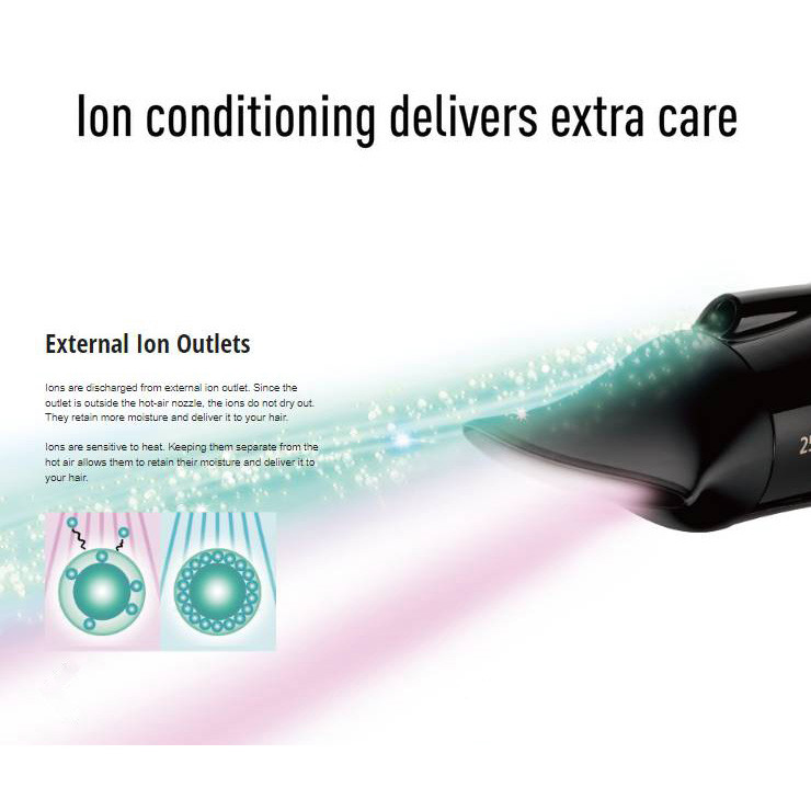 ساخت تایلند - دارای سنسور حرفه ایی کنترل کننده گرما - طراحی منحصر بفرد دریچه خروجی یون مجزا با 50 درصد تاثیر بیشتر برای درخشندگی و لطافت بیشتر موها - دارای موتور قدرتمند 2300 واتی محافظت شده با طول عمر بالا میباشد - با استفاده از سنسور کنترل کننده گرما در دهانه سشوار مانع از خروج باد با گرمای شدید که به ریشه مو و پوست سر آسیب وارد کند میشود و این سنسور باعث میشود که بر خلاف سایر سشوارها با بالا رفتن دما به قطعات داخلی فشار وارد نشود و نیز به مرور زمان دچار افت کارایی نشود – این دستگاه دارای ژنراتور تولید یون دائمی میباشد و مانند بسیاری از سشوارها بعد از دو سه سال نیاز به نصب مجدد یا شارژ ندارد که موجب درخشندگی بیشتر موها و جلوگیری از شکستن و گره خوردگی موها میشود – دارای استاندارد IEC-standard drying performance - توان خشک کنندگی 2500 واتی - تاثیر گذاری عمیق روی ساقه و بدنه موها که بعد از دو سه ماه استفاده تاثیر مثبت آن قابل مشاهده میشود – این دستگاه با وجود سنسورها و محافظت کننده ها در سطح اول سشوارها با عدم آسیب رسانی به مو قرار دارد – ابعاد سشوار 232 x 222 x 92 میلی متر – وزن دستگاه 460 گرم میباشد – دارای نازل جدید و حرفه ایی که سرعت خشک کردن موها را بالا میبرد - دارای شات سرد برای تثبیت حالت دهی به مو -
