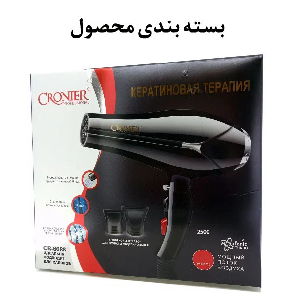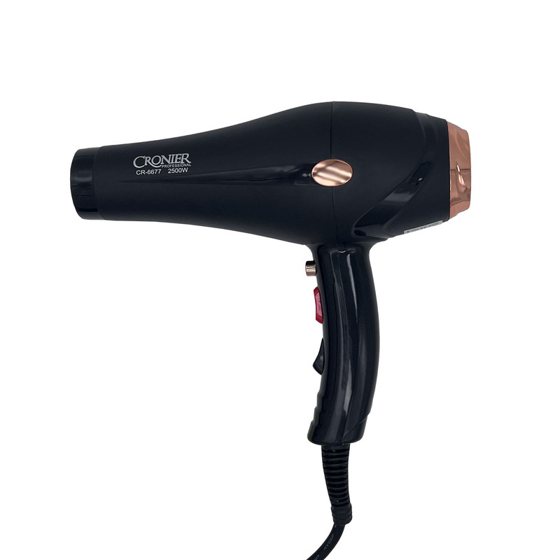 سشوار نیمه حرفهای کرونر مدل CR-6677 2500W، موتور AC، توان مصرفی 2500 وات، دارای قابلیت باد سرد، فناوری تولید یون، وزن 540 گرم، به همراه 2 عدد سری متمرکزکننده