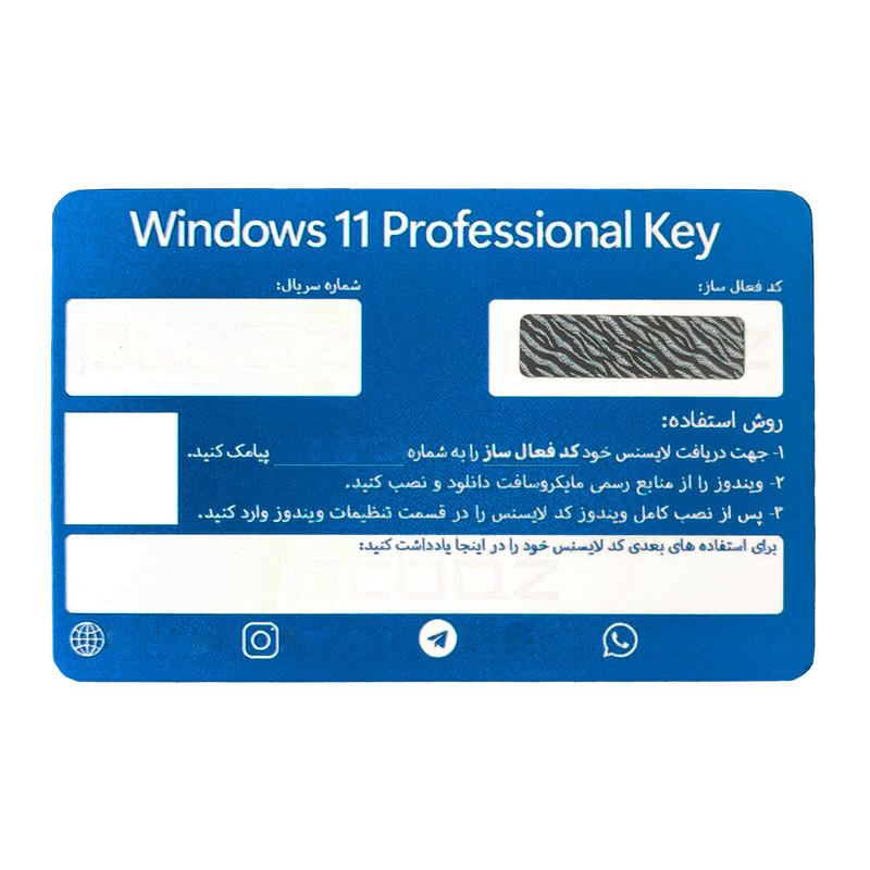 **روش استفاده:** ۱. **نصب ویندوز:** - سیستم را از طریق **فلش بوت** راهاندازی کنید. - ویندوز 11 پرو را به صورت کامل نصب نمایید. ۲. **دریافت لایسنس:** - کد فعالسازی درجشده روی کارت را به **شماره اعلامشده** ارسال کنید. - پس از تأیید، **کد لایسنس اورجینال** برای شما ارسال خواهد شد. ۳. **فعالسازی ویندوز:** - با استفاده از **راهنمای همراه محصول**، کد دریافتی را وارد کنید. - ویندوز شما به صورت **رسمی و اورجینال** فعال خواهد شد.