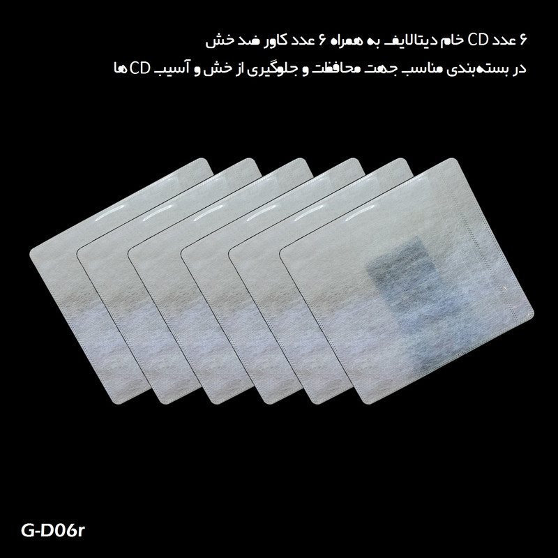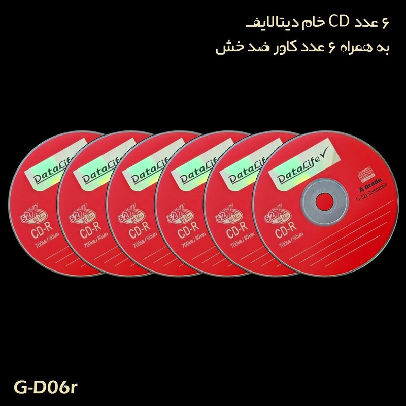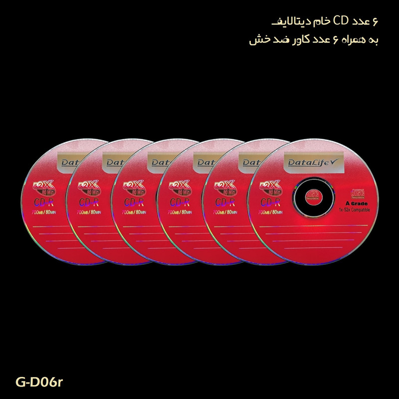 تعداد 6 عدد CD خام از برند "دیتالایف Datalife" به همراه 6 عدد کاور ضد خش جهت محافظت و جلوگیری از هرگونه خط و خش.
