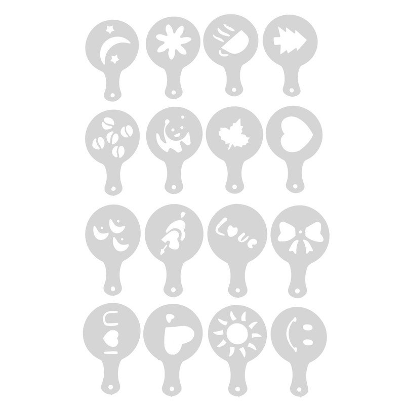 هر بسته شامل 16 عدد شابلون تزیین قهوه در مدل های مختلف برای طراحی و تزیین قهوه و دسر و کیک