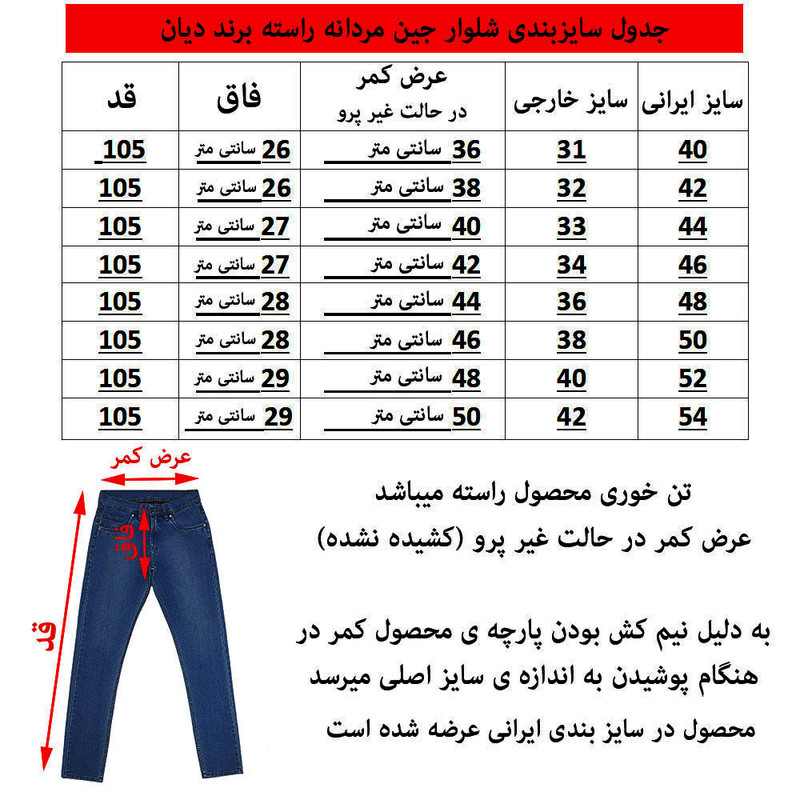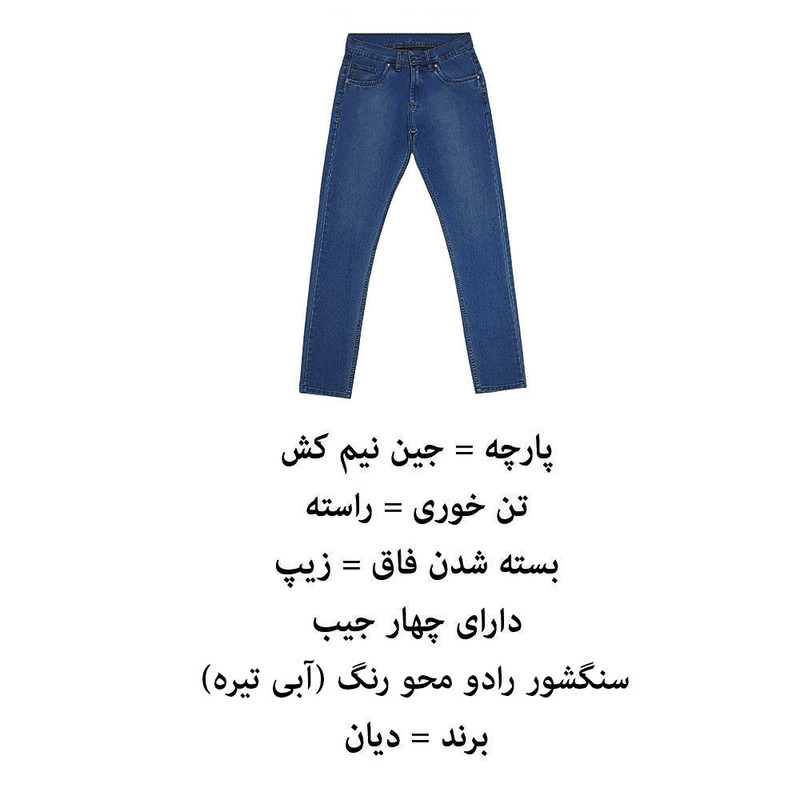 (پارچه جین نیم کش) (تن خوری راسته ) (دارای چهار جیب) (رنگ آبی تیره) (سنگشور رادو محو) (برند دیان) (بسته شدن فاق با زیپ) (سایزبندی ایرانی) (جدول انتخاب سایز در قسمت تصاویر)