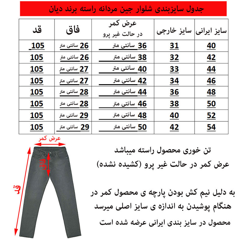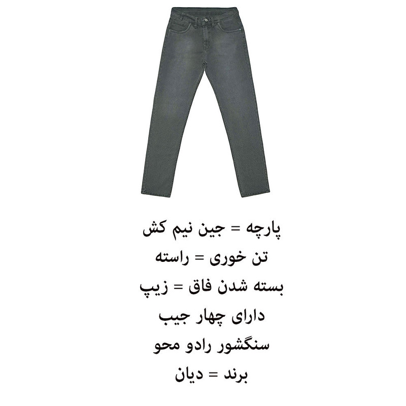 (پارچه = جین نیم کش) (تن خوری = راسته) (دارای چهار جیب) (سنگشور رادو محو) (برند دیان)