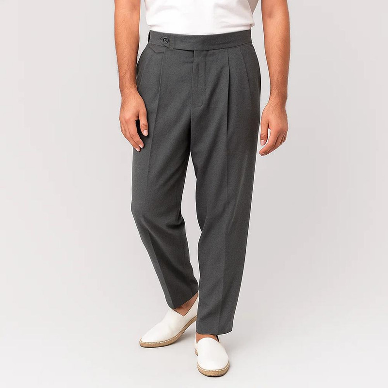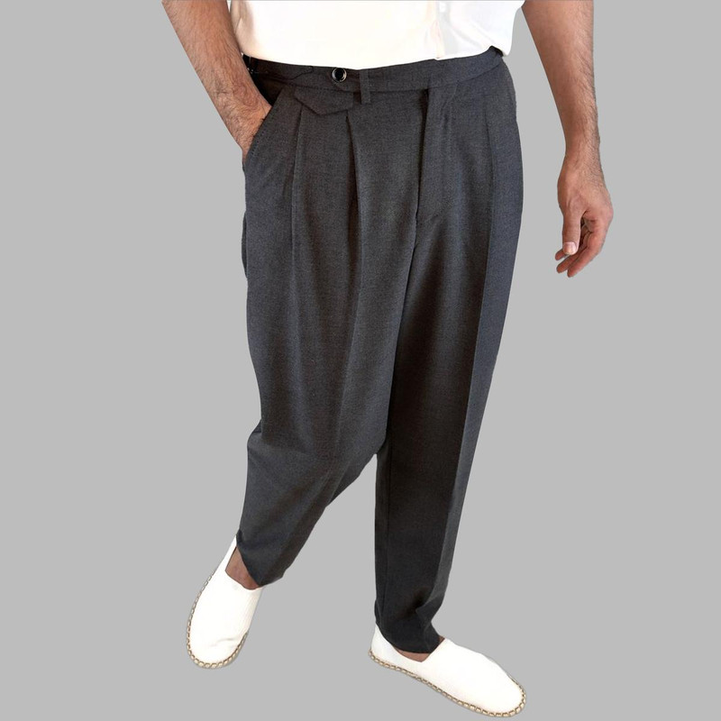 بزیاق (نوعی فاستونی)/ تضمین دوخت و کیفیت/ خنک و راحت/ تزئین جیب در کمر/ پیلی دار/ کمر همگرد/مناسب استایل های الد مانی و ایتالین استایل و .../ بدون آبرفت/ چهارفصل/ رنگ: طوسی ملانژ