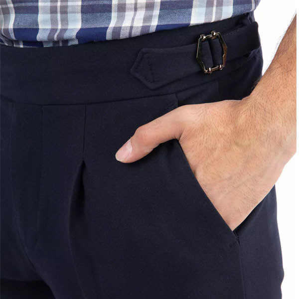 جزئیات مدل: بند و سگک در کناره کمر شلوار، یک پیلی در جلو، دمپا قابل کوتاه یا پاکتی شدن است
