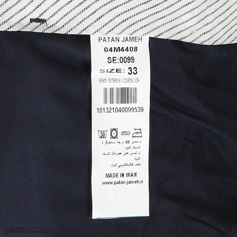 جنس: فاستونی - 65 درصد پلی استر30 درصد ویسکوز + 5 درصد لاکرا (کش) / ضخامت متوسط/ نحوه بسته شدن دکمه و زیپ + قزن / استایل راسته کلاسیک / دمپا معمولی/ رنگ سرمه ای .