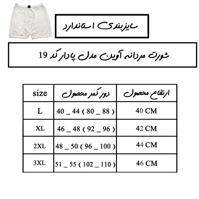 الگو های استاندارد محصول : سایز L ( مناسب برای دور کمر 42 تا 46 سانت ) سایز xl ( مناسب برای دور کمر 46 تا 50 سانت ) سایز xxl ( مناسب برای دور کمر 51 تا 53 سانت ) سایز xxxl ( مناسب برای دور کمر 54 تا 58 سانت ) سایز 4XL ( مناسب برای دور کمر 58 تا 60 سانت ) تراکم مناسب پارچه ( مناسب برای تمام فصول ) نکته : قواره محصولات آوین استاندارد می باشد . لطفا در هنگام خرید جدول سایزبندی محصول را در قسمت تصاویر دیدن فرمایید .