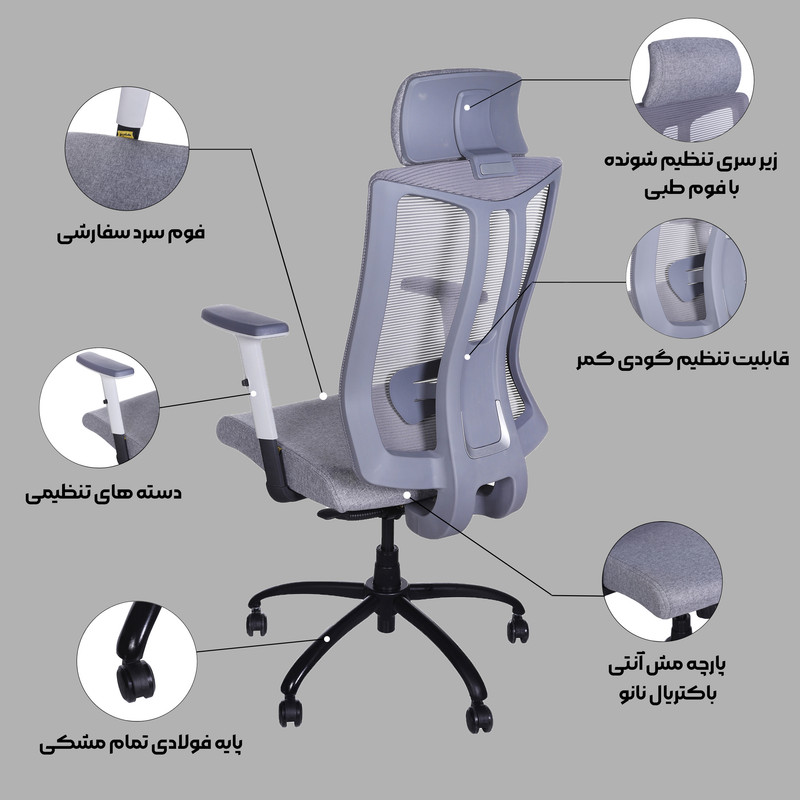 روکش پشتی و روکش زیر سری: پارچه مش رویال پلاس با قابلیت گردش هوا و آنتی باکتریال نانو