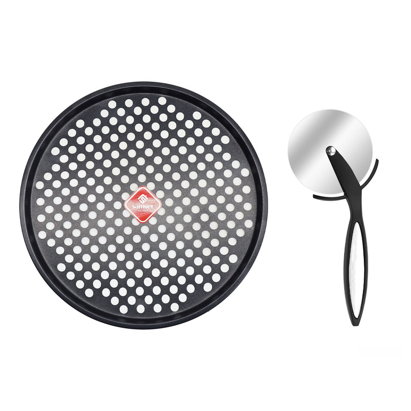 ست سینی پیتزا ۳۲ سانتیمتری مشبک با روکش تفلون به همراه پیتزابر آلومینیومی سامست، ترکیبی حرفهای برای پخت یکنواخت و برش دقیق پیتزا است. طراحی مشبک باعث گردش بهتر هوا و ترد شدن پیتزا از زیر میشود و پیتزابر خوشدست نیز برشهای تمیز و آسان را فراهم میکند.