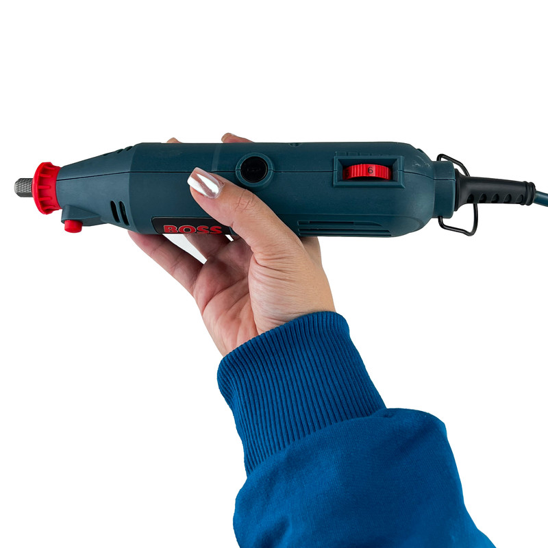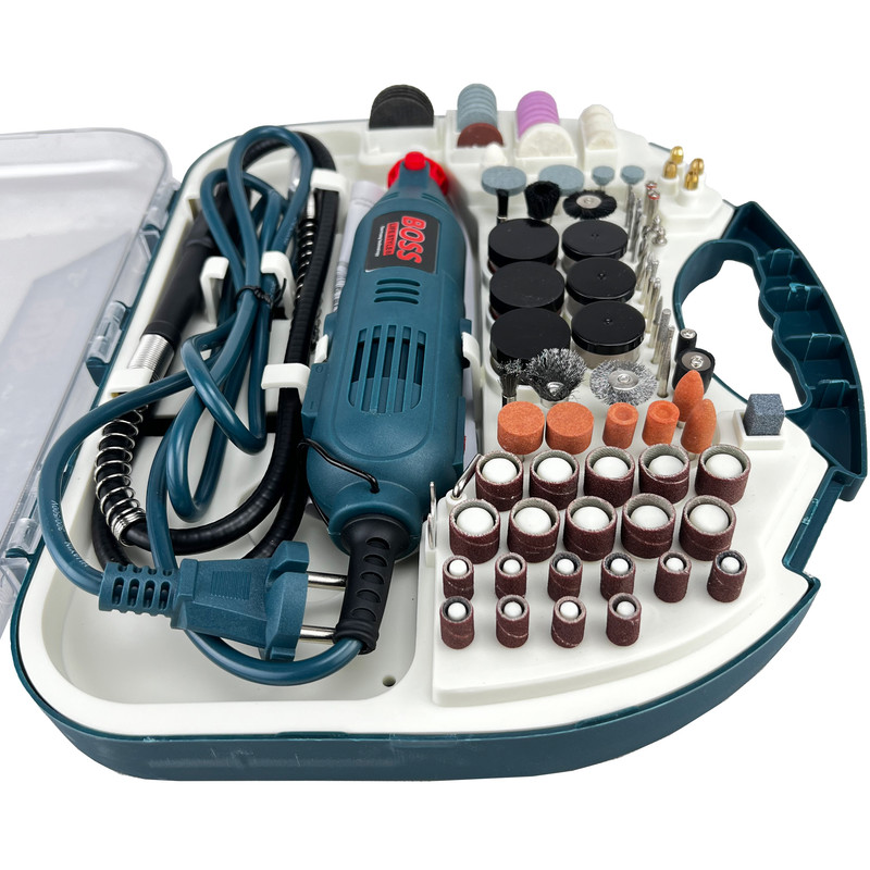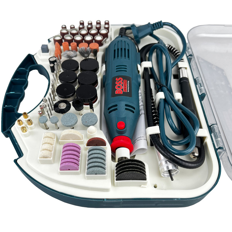 -برند: باس BOSS - کاربرد: حکاکی فلز و سنگ و چوب - دارای ۲۱۱ عدد سری مختلف - قابلیت برش با زاویه: دارد - امکان اضافه کردن مته تا سایز ۶mm - قطر سه نظام : ۳.۲ م.م - سرعت گردش آزاد: ۸۰۰۰ الی ۳۲۰۰۰ دور در دقیقه - دارای قابلیت تغییر سرعت ( دیمردار) - دارای فرز خرطومی - دارای قفل جهت تعويض ابزار بدون آچار - دارای کاور پلاستیکی دستهدار