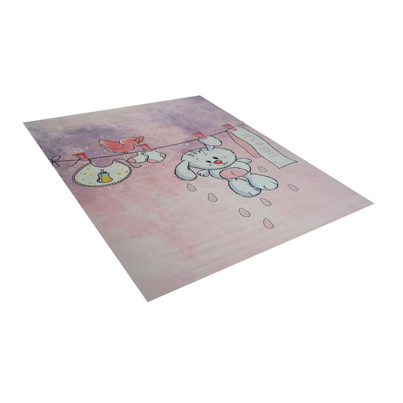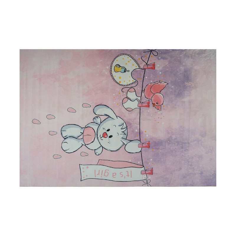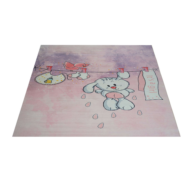فرش ماشینی زانیس مدل اتاق کودک طرح خرگوشک دختر زمینه گلبهی