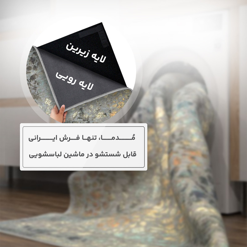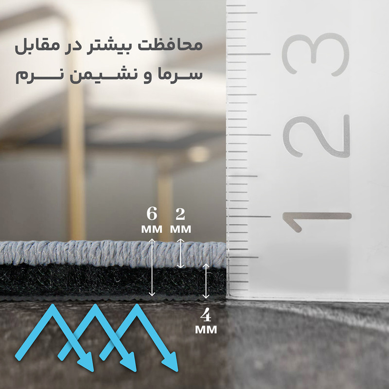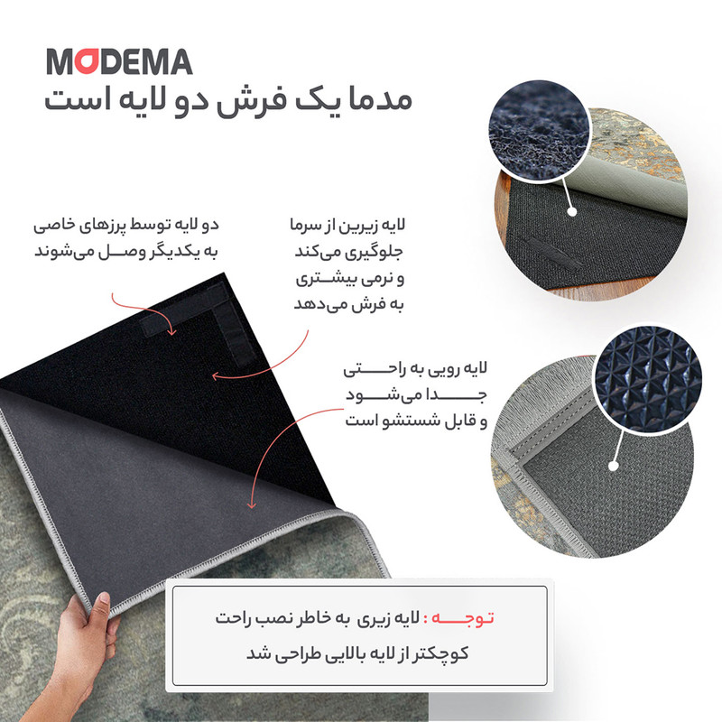 "توجه: فرش مدما فرشی دولایه است و ضخامت لایه رویی: ۲ میلی متر | ضخامت لایه زیرین: ۴ میلی متر و مجموع ضخامت فرش: ۶ میلی متر میباشد. همچنین قابل ذکر است به منظور اتصال بهتر دولایه روی هم و حفظ قابلیت ضدلغزش بودن فرش، ابعاد لایه زیرین کوچکتر از لایه رویی طراحی شده است و در تصاویر رسمی محصول نیز مشخص است.
