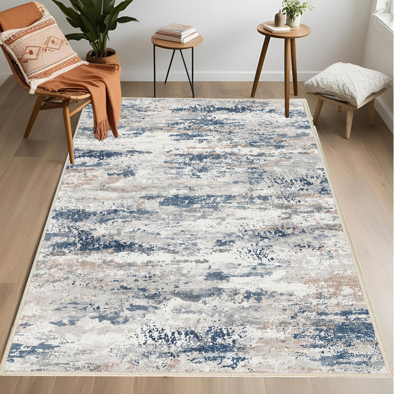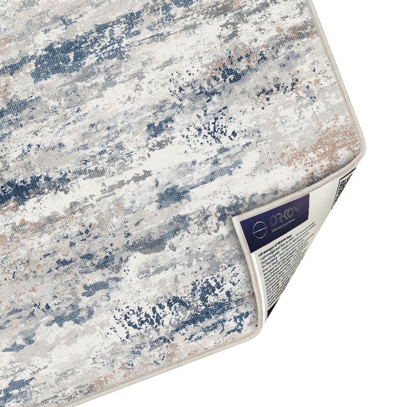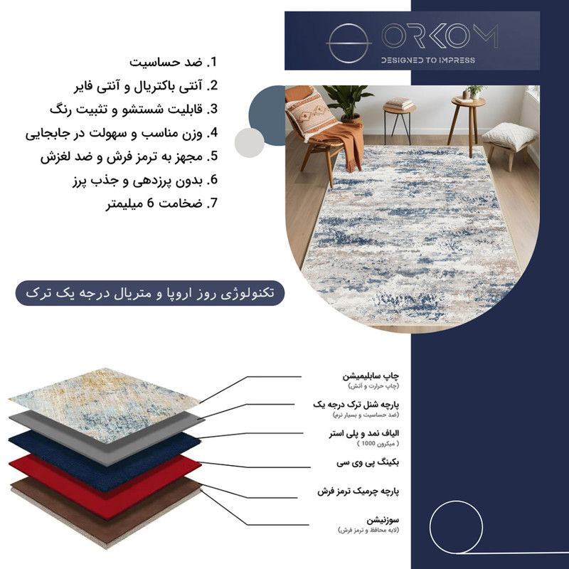 فرش ماشینی 1000 شانه زمینه کرم حاشیه آبی مدل نانو چاپ بدون پرز طرح مینیمال دلتا کد OR.1122.03