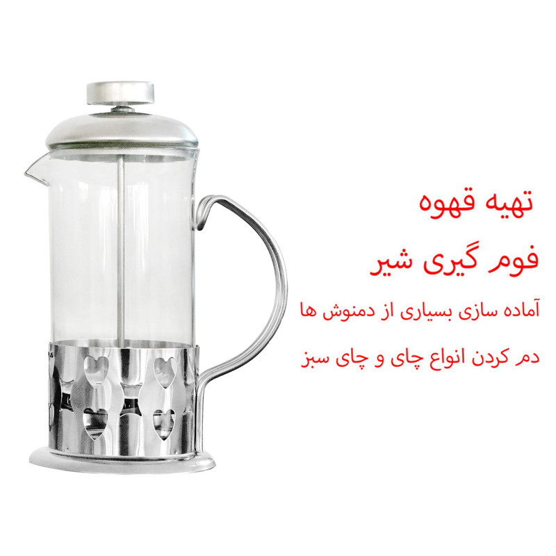 محصول کشور ترکیه - جنس شیشه حرارتدیده - گرم نگه داشتن محتویات داخل به مدت طولانی - گنجایش بین 3 تا 4 فنجان - فرنچ پرس یکی از کلاسیکترین روشها برای دمکردن قهوه است - فرنچ پرس برای تهیه انواع قهوه به خصوص قهوه فرانسه کاربرد دارد - همچنین برای تهیه فوم شیر کاپوچینو هم می توان از فرنچ پرس استفاده کرد - آماده کردن بسیاری از دمنوش ها - دم کردن انواع چای و چای سبز