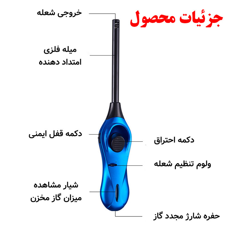 رنگ متالیک بسیار جذاب - مخزن گاز بسیار بزرگ - بدنه دارای شیار جهت مشاهده میزان گاز موجود در مخزن - دارای قابلیت تنظیم میزان شعله - میله بلند جهت ایمنی بیشتر و فاصله بیشتر دست از شعله در هنگام استفاده - دارای قفل کودک - قابلیت شارژ مجدد مخزن گاز