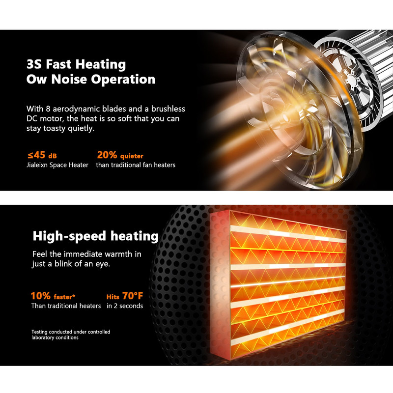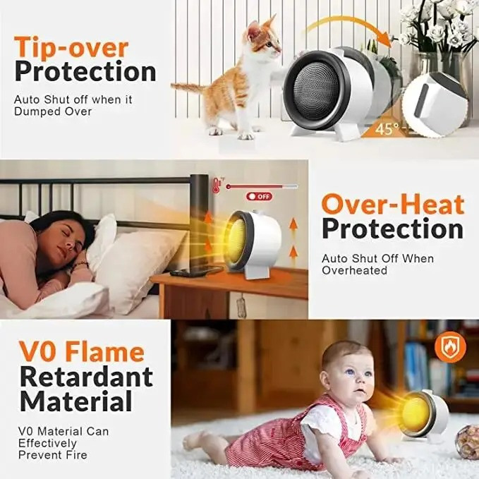 گرمایش گسترده و سریع :این دستگاه با طراحی ویژه و زاویه ۸۳ درجه، در عرض ۳ ثانیه از پاها تا بدن شما را در زیر میز گرم میکند.عملکرد کم صدا : بخاری کم صدای ما که برای چرت زدن یا خوابیدن در شب ایدهآل است، شما، فرزندانتان یا همسایگانتان را آزار نمیدهد.در زمستان، میتوانید از یک بخاری برقی برای خشک کردن دستهای خیس پس از شستن آنها استفاده کنید. همچنین میتوانید هنگام چرت زدن در حمام از گرما لذت ببرید.با قرار دادن بخاری جمع و جور خود روی میز قهوه یا میز اداری در حین کار، بهرهوری خود را افزایش داده و از هوای گرم لذت ببرید.محافظت در برابر واژگونی و محافظت در برابر گرمای بیش از حد.«در بالای دستگاه یک دکمه خاموش کردن وجود دارد؛ فن، سرعت شماره ۱، سرعت شماره ۲، روشن کردن بخاری از حالت آماده به کار به سختی انجام میشود. دسیبل حدود ۳۰ دسیبل است. گرمای شماره ۱ خوب و داغ است. گرمای شماره ۲ هم خوب و داغ است، شاید داغتر از شماره ۱.»