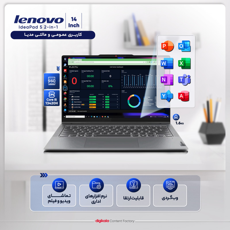 لپ تاپ 14 اینچی لنوو مدل IdeaPad 5 2-in-1 14IRH9-i5 13420H-16GB LPDDR5-512GB SSD-IPS-Touch به همراه قلم