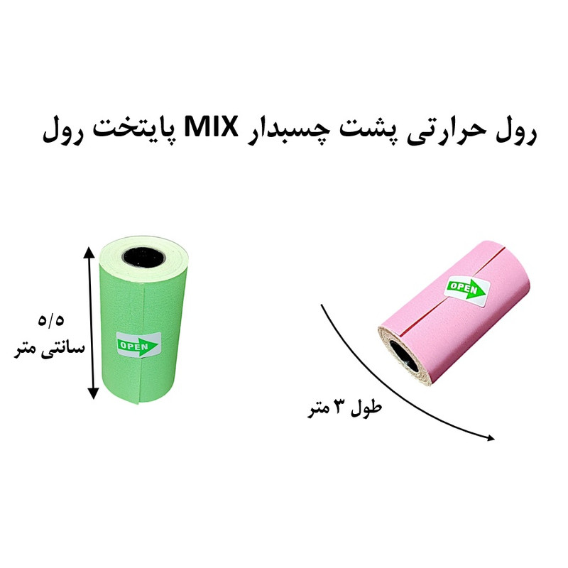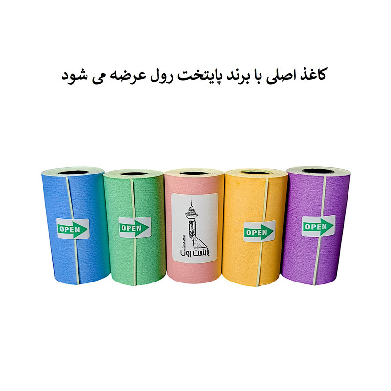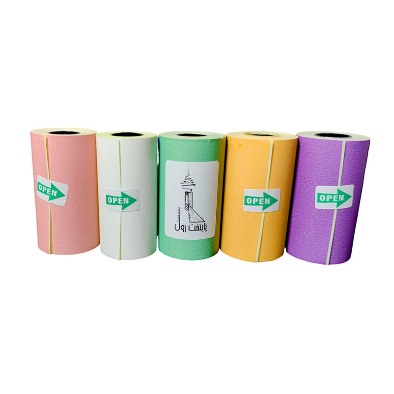 رول کاغذ پرینتر حرارتی مدل پشت چسبدار چند رنگ (پنج رنگ از میان 8 رنگ زرد، قرمز، آبی، بنفش، سبز، نارنجی، سفید، صورتی) پایتخت رول بسته 5 عددی، عرض 55 میلی متر، متراژ 3 متر، مخصوص دستگاه های خرگوشی و مینی پرینتر و چاپگر بلوتوثی، کاغذ حرارتی با کیفیت بالا، رنگ کاغذ چند رنگ (پنج رنگ از میان 8 رنگ زرد، قرمز، آبی، بنفش، سبز، نارنجی، سفید، صورتی) و براساس موجودی ارسال خواهد شد، رنگ چاپ مشکی، تعداد 5 تا عدد در پکیج فروش، ماندگاری چاپ ۳ سال، کیفیت بالای کاغذ و برش عالی و بدون پرز