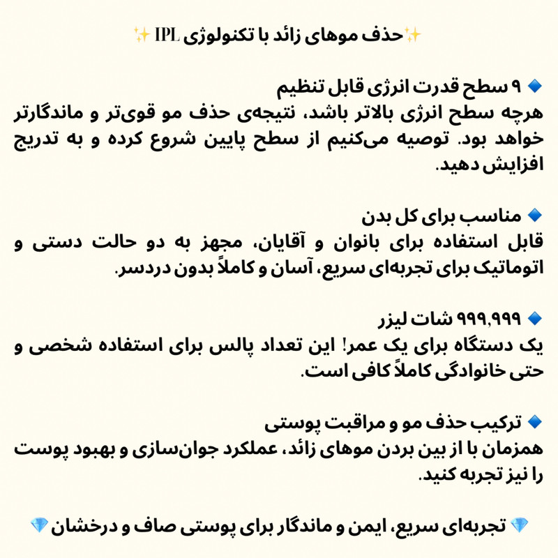 دارای دو سَری مگنتیک قابل تعویض/ دارای حسگر هوشمند پوست/ دارای 9 درجه شدت لیزر / دارای سه حالت کاربری لیزر ضد آکنه، جوانساز و حذف مو زائد / قابلیت استفاده تا 999999 شات لیزر / دارای صفحه نمایش لمسی / مناسب صورت و بدن / دارای خنک کننده یخی تا منفی سه درجه سانتیگراد / استفاده بدون درد / دارای حالت افزایش دهنده کلاژن پوست و جوانساز / دارای کاربرد ضد آکنه / دارای کاربری آسان و خانگی / سری دستگاه ساخته شده از یاقوت کبود / مناسب آقایان و بانوان / امکان استفاده با 9 سطح انرژی متفاوت