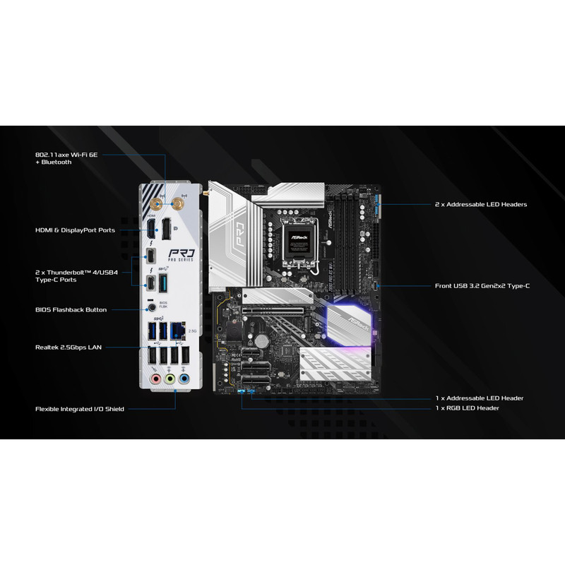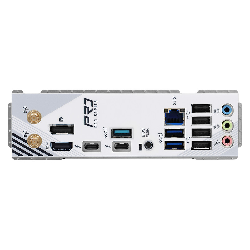 دو عدد پورت آنتن / یک عدد پورت HDMI / یک عدد پورت DisplayPort 1.4 / دو عدد پورت Thunderbolt 4 / USB4 نوع Type‑C با پهنای باند 40 گیگابیت/ یک عدد پورت USB 3.2 Gen 2 نوع Type‑A با سرعت 10 گیگابیت / دو عدد پورت USB 3.2 Gen 1 / چهار عدد پورت USB 2.0 / یک عدد پورت شبکه RJ‑45 LAN / یک عدد دکمه BIOS Flashback / جکهای صدای HD شامل Line in / Front Speaker / Microphone