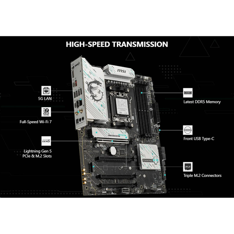 Wi-Fi 7 با ماژول داخلی M.2 / پشتیبانی از باندهای ۲.۴ / ۵ / ۶ گیگاهرتز / سرعت تا ۵.۸ گیگابیت بر ثانیه / سازگار با استانداردهای a/b/g/n/ac/ax/be