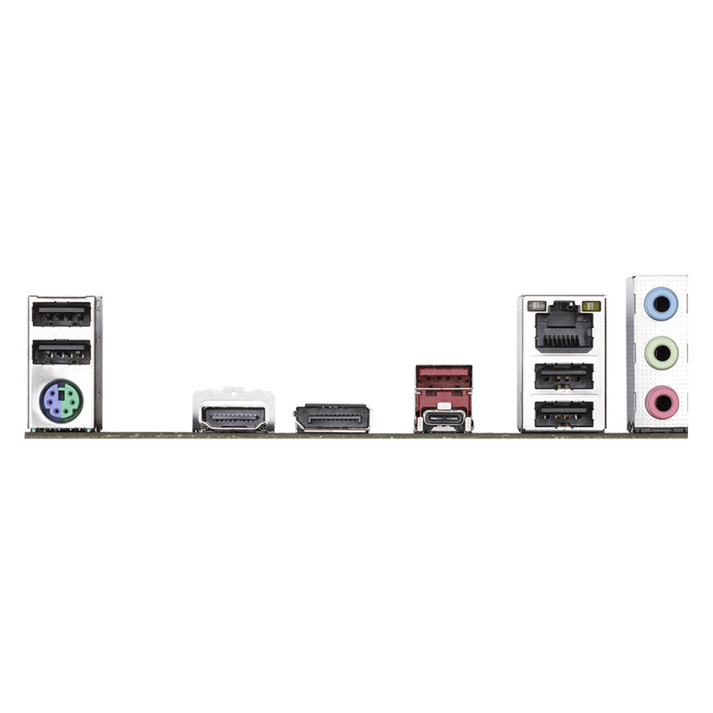 یک پورت PS/2 برای کیبورد/ماوس / یک پورت USB Type-C از نوع USB 3.2 Gen 2x2 / یک پورت USB 3.2 Gen 2 Type-A (قرمز) / چهار پورت USB 2.0/1.1 / یک پورت HDMI / یک پورت DisplayPort / یک پورت RJ-45 / سه جک صدا