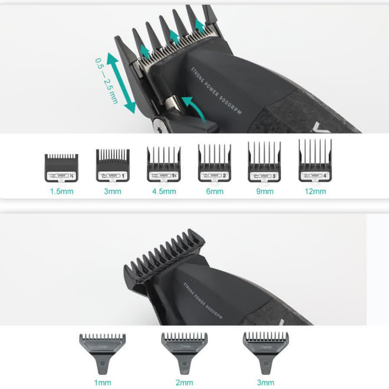برس ، دو عدد کابل شارژ ، ۳ شانه راهنمای برش (۱-۲-۳ میلیمتر) ، ۶ شانه راهنمای برش (۱.۵-۴.۵-۳-۶-۹-۱۲ میلیمتر)