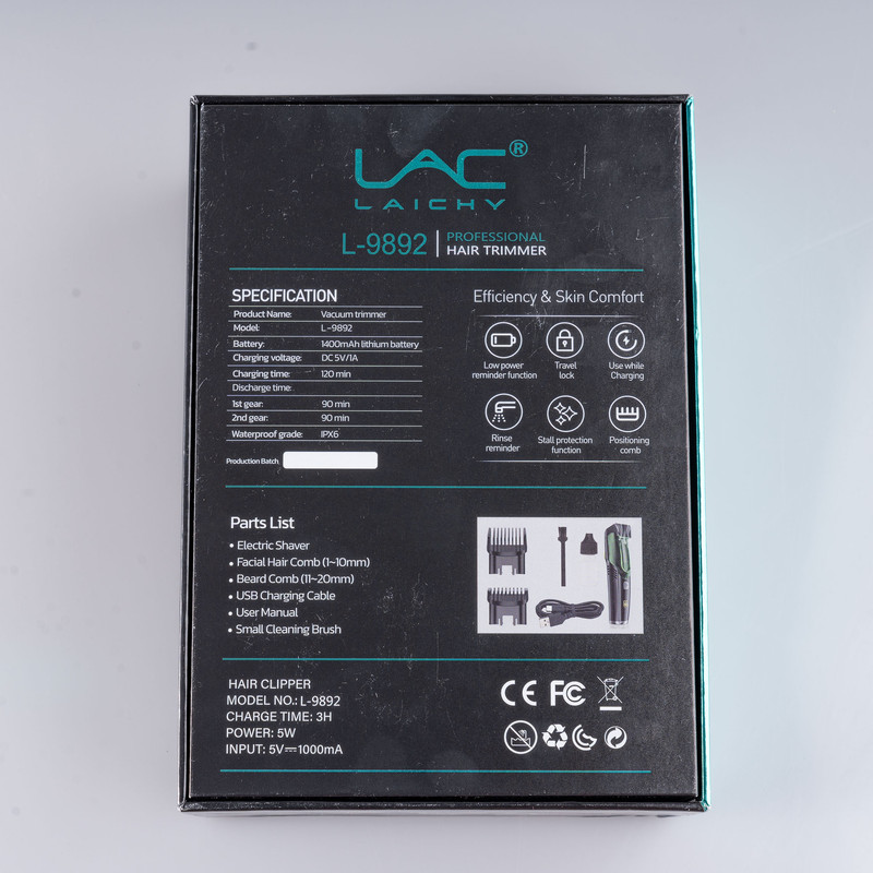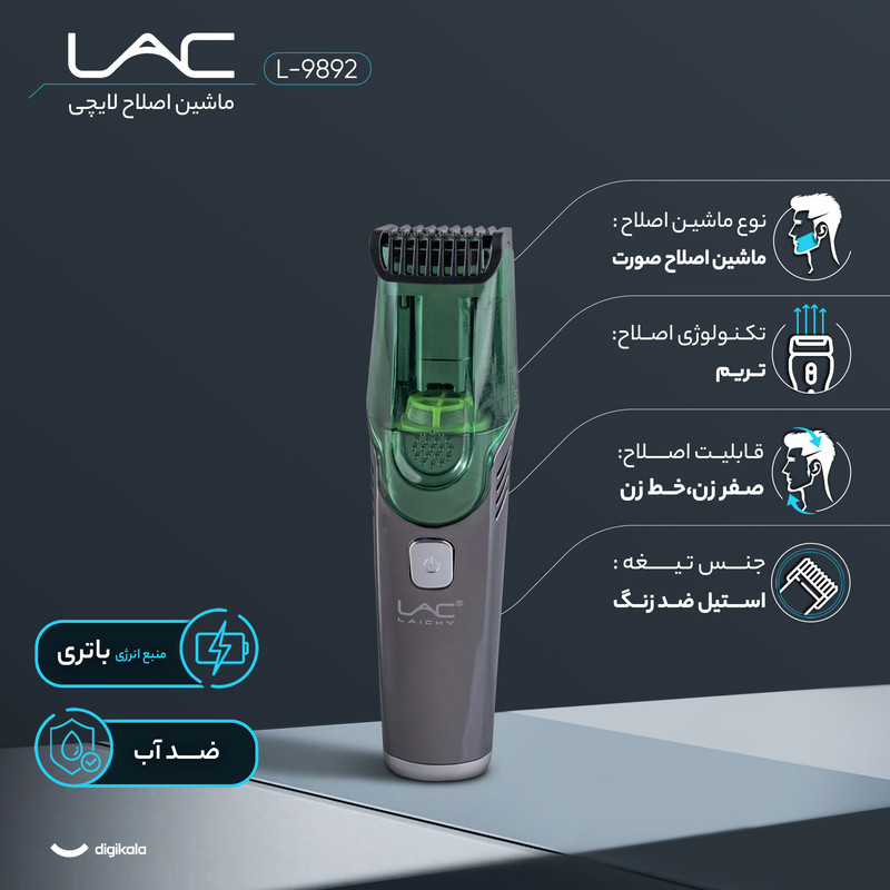 ماشین اصلاح موی صورت شارژی لایچی مدل L-9892، اصلاح به صورت خط زن و حجم زن، طراحی ارگونومیک، منبع انرژی با باتری، تکنولوژی اصلاح به صورت تریمر، اندازه اصلاح از 1 تا 20 میلیمتر، مدت زمان شارژ 180 دقیقه و مدت زمان استفاده پس از شارژ 120 دقیقه