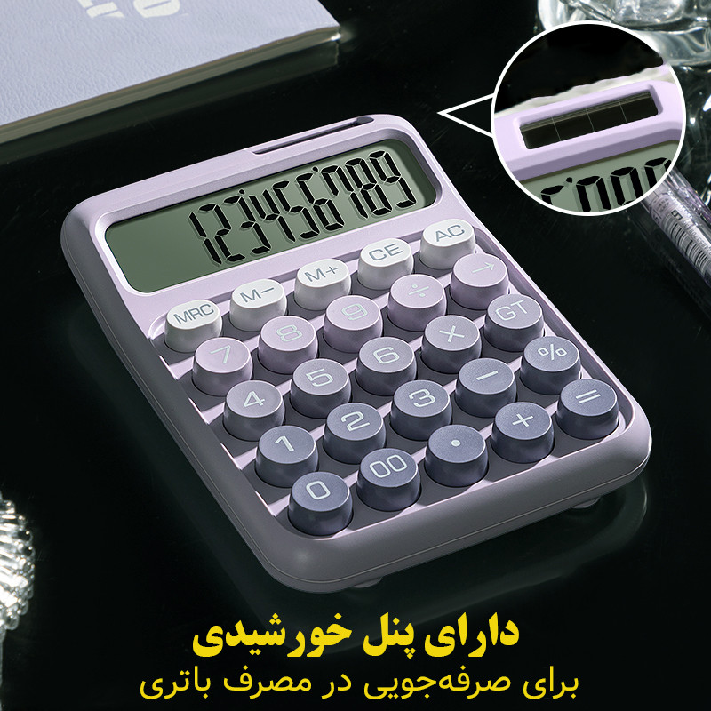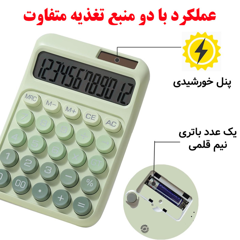 صفحه نمایش 12 رقمی با نمایش بزرگ اعداد - دارای پنل خورشیدی جهت صرفه جویی در مصرف باتری - عملکرد با دو منبع تغذیه متفاوت (انرژی خورشیدی و یا یک عدد باتری نیم قلمی) - خاموشی خودکار در صورت استفاده نشدن - دارای 25 کلید - دارای حافظه جهت ذخیره محاسبات - دکمه های بزرگ و راحت جهت کاهش اشتباه در محاسبات - دارای خمیدگی در قسمت صفحه نمایش جهت ارئه دید بهتر - دارای چهار پد سیلیکونی ضد لغزش در قسمت زیر محصول