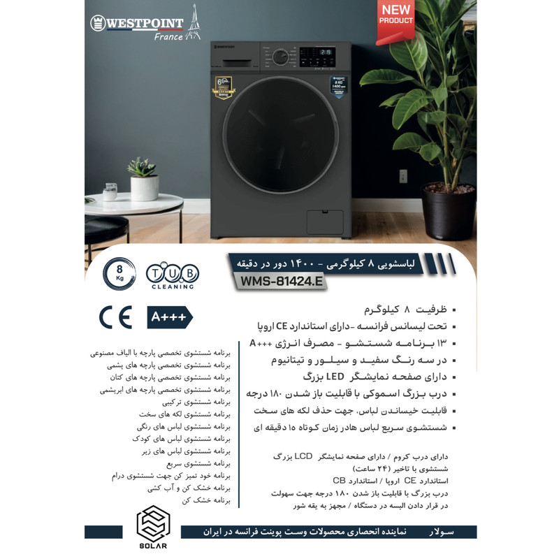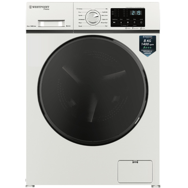 لباسشویی ۸ کیلو - ۱۴۰۰ دور - مصرف انرژی +++A -دارای ۱۳ برنامه شستشوی تخصصی - صفحه نمایشگر بزرگ LED - برنامه شستشوی سریع ۱۵ دقیقه - برنامه شستشوی البسه کودک - برنامه شستشوی البسه زیر - شستشوی اکونومیک - شستشوی البسه ورزشی ( لکه سخت ) - شستشوی ترکیبی -