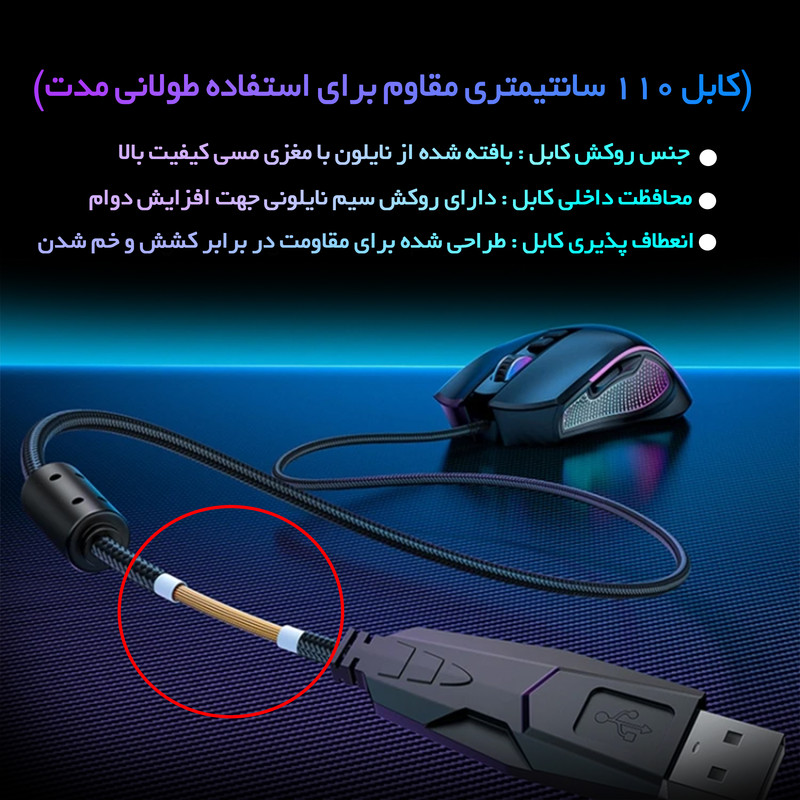 رنگهای متنوع: نورپردازی موس شامل طیف گستردهای از رنگها است که بهصورت خودکار تغییر میکنند و جلوههای نوری جذابی ایجاد میکنند.